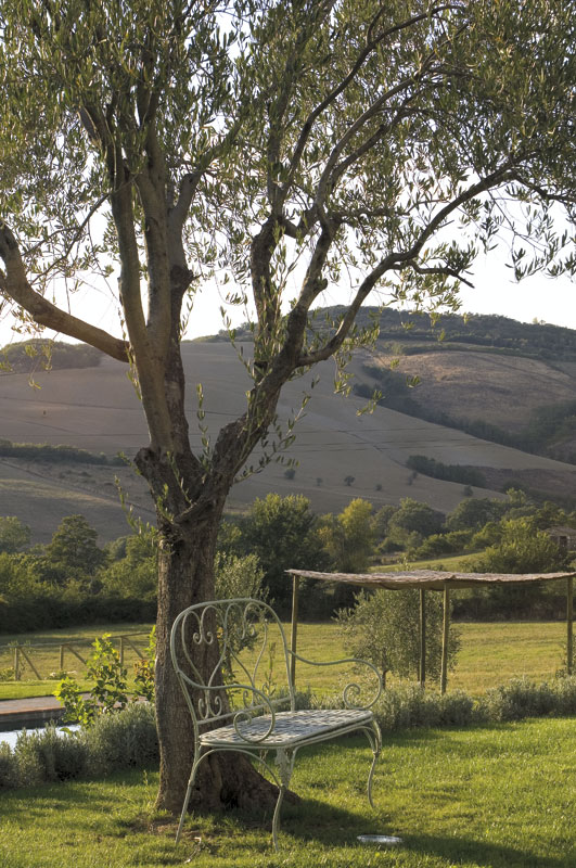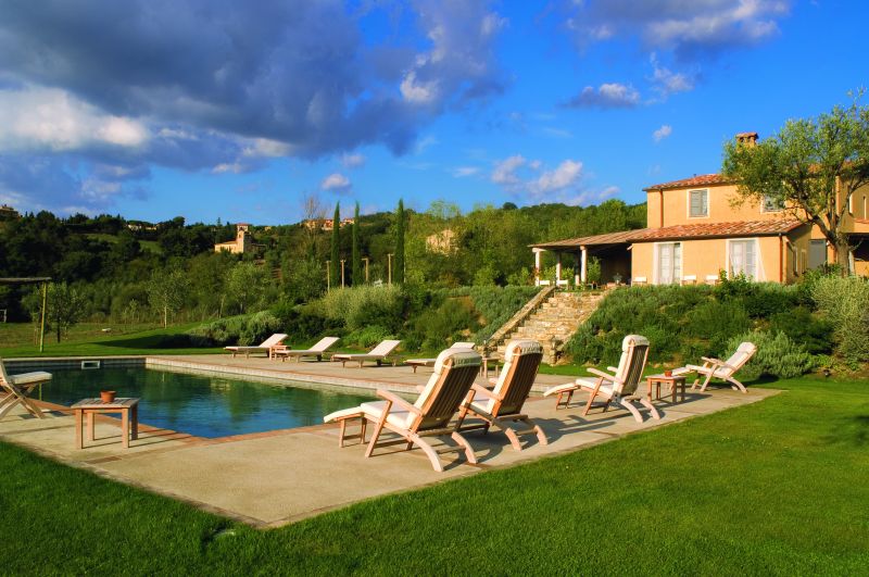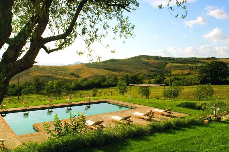 Fra den flisebelagte terrasse er der udsigt til poolen og til Val d’Orcia-området. Trapper fører ned til pool-området, hvor der er solsenge, stole og borde. Swimmingpoolen er naturligt opvarmet og er åben fra 1. maj til 30.september. Haven er stor og åben med udsigt over det omkringliggende landskab og en nærliggende olivenlund.
