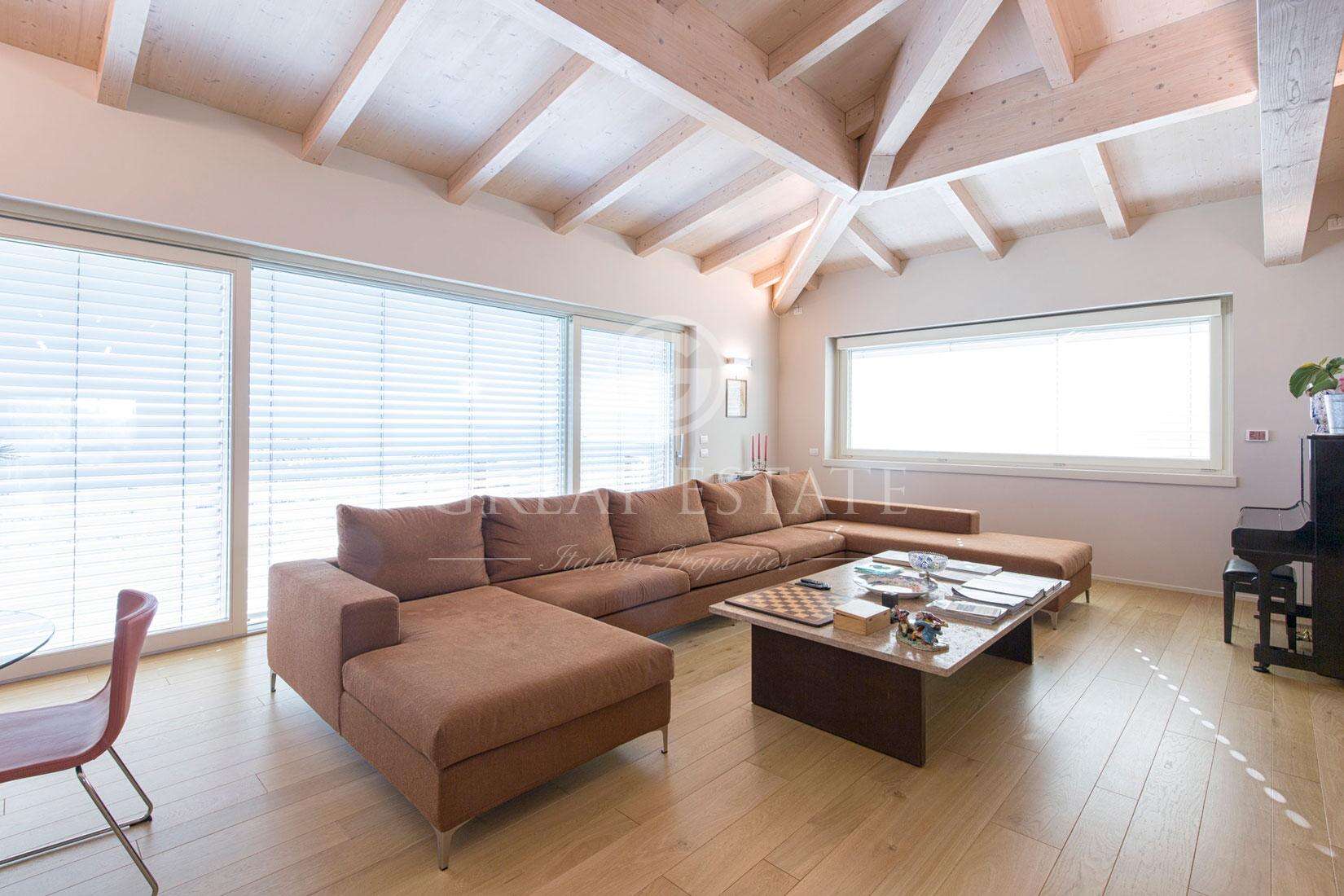 The villa covers an area of 465sqm on three levels: in the basement we have a solar greenhouse, a living/dining room, a large kitchen, a bathroom, two bedrooms with private bathrooms, a laundry, a fitness area, a utility room and a garage; at ground floor we find a bedroom with private bathroom, three large living rooms and two bathrooms; on the first floor we have three bedrooms with bathroom and a study.