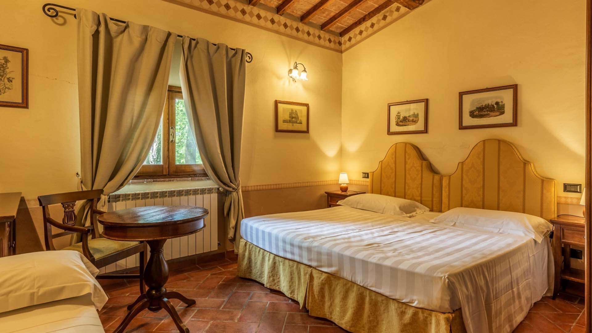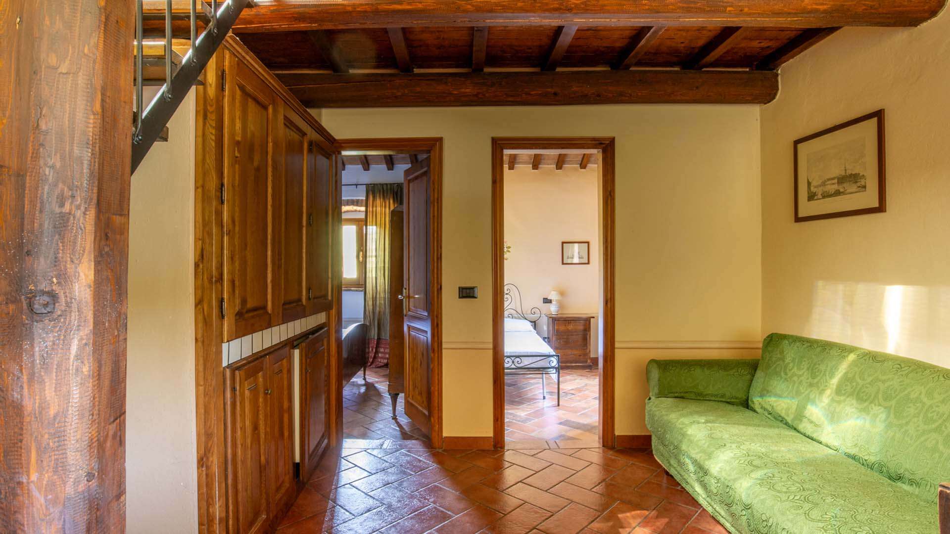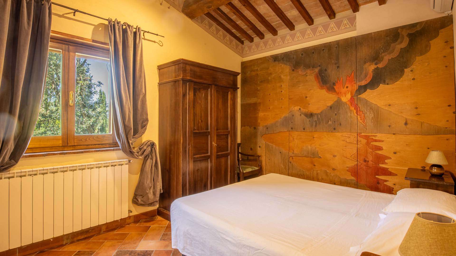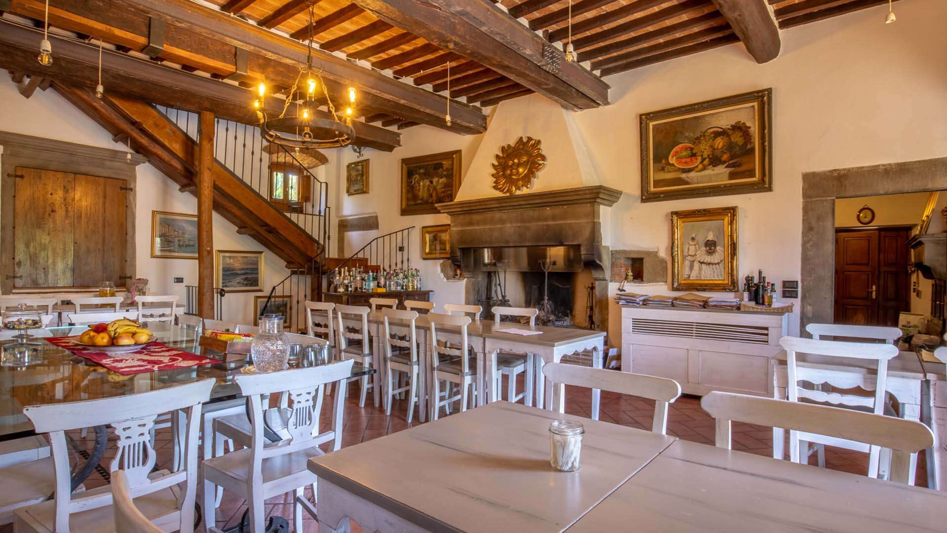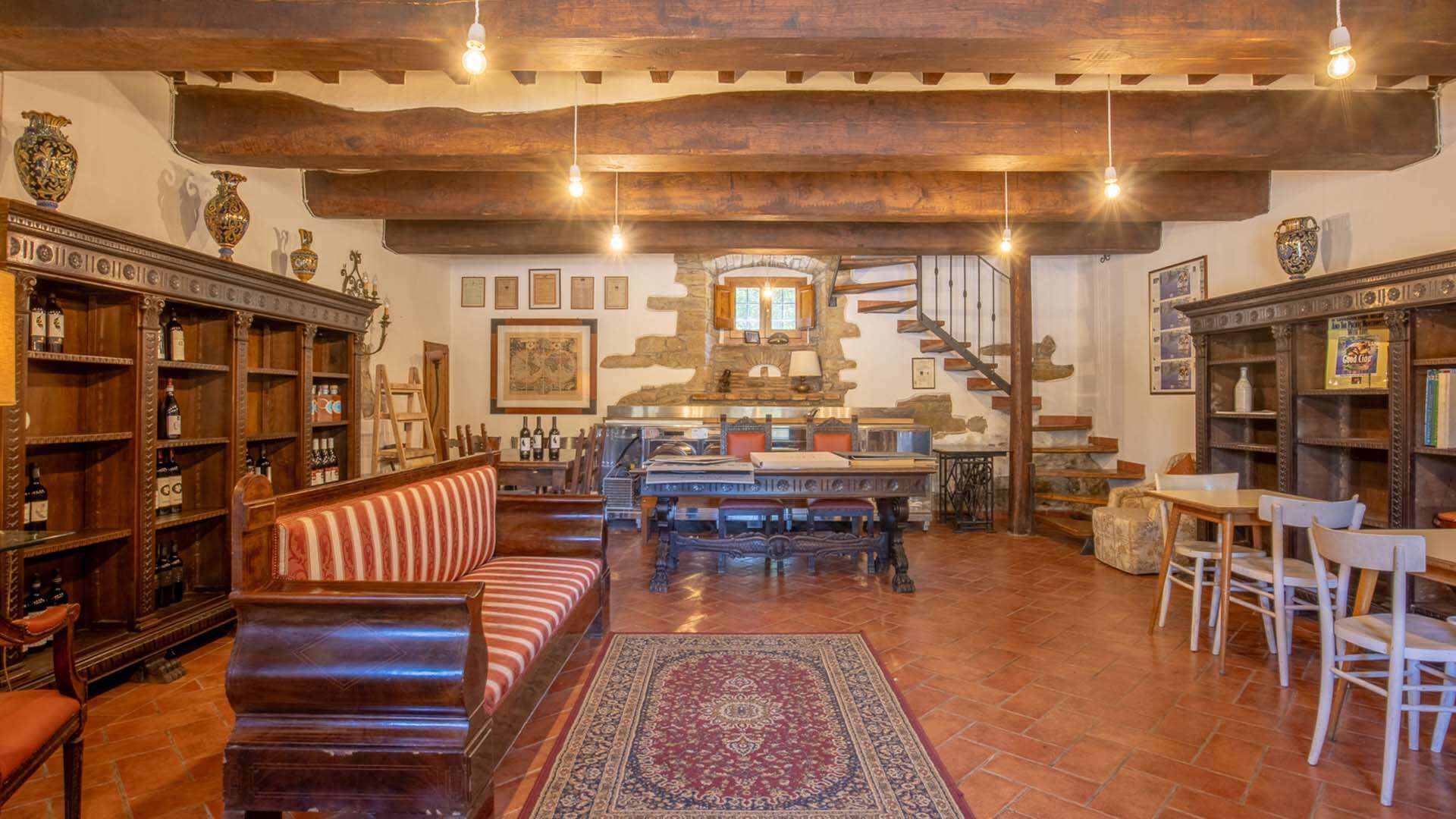 The majestic main stone farmhouse is arranged over three levels. The Historic Residence, formerly a 16th-century convent, has been expertly restored and features a living room, a spacious kitchen, a suite with a private bathroom, and panoramic views. Each room is adorned with unique frescoes. The second section on the ground floor houses a welcoming lounge, a fully equipped kitchen, and storage. On the first floor, there is a large lounge with fireplace, a three-bedroom apartment with three bathrooms, a laundry room, and a junior suite with bathroom.