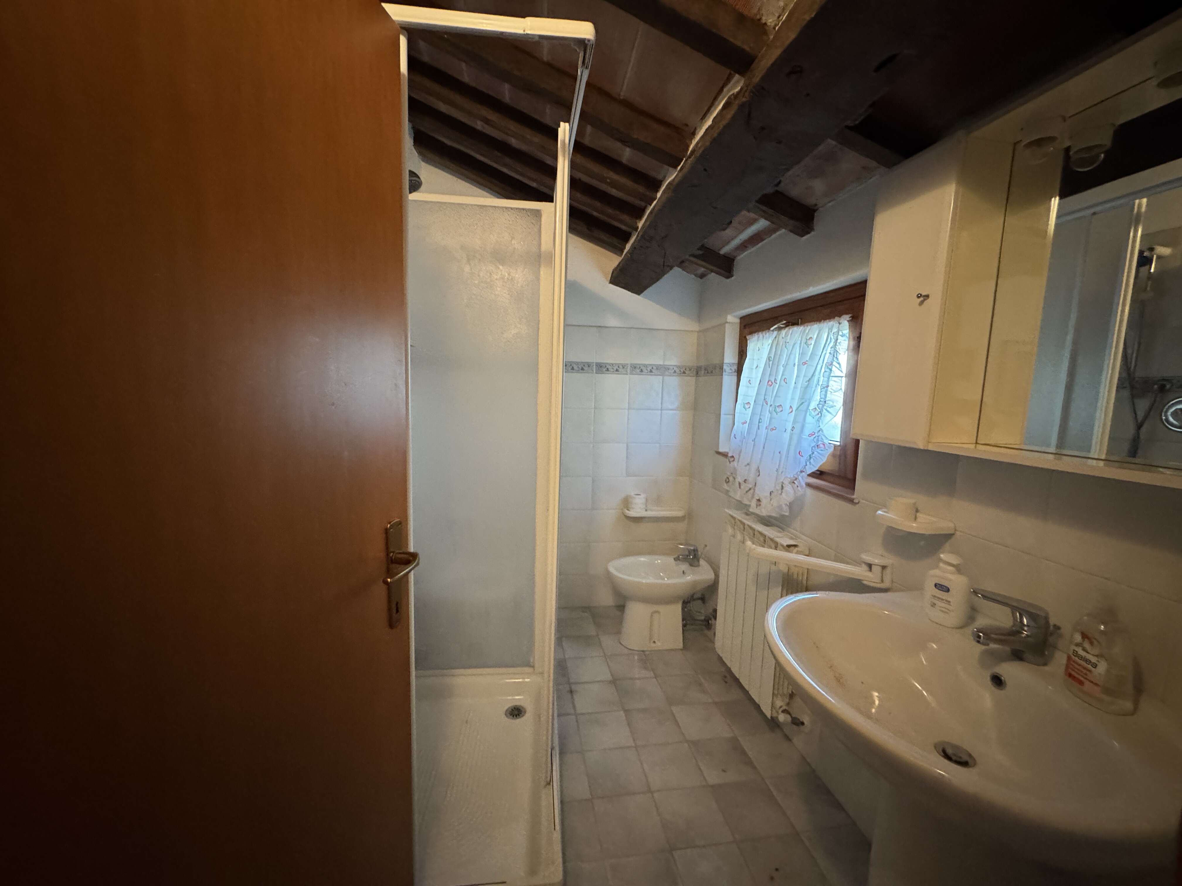 Inside, the farmhouse develops over two levels and is divided into three apartments: two on the ground floor and one on the first floor; the first two overlook the outside and guarantee brightness thanks to their east-west exposure. The first apartment comprises a kitchenette and living room, a hallway, a bathroom with shower, and a double bedroom. The second ground-floor apartment includes an entrance living room with kitchenette, two bedrooms—one with en-suite bathroom—and an additional bathroom. On the first floor, the third apartment features a living room with a wood-burning fireplace, a large kitchen, two bedrooms, and a bathroom. A separate guesthouse consists of a kitchenette and living room, one bedroom, and a bathroom. Despite the presence of historic systems, regular maintenance has been carefully carried out to ensure comfortable livability.