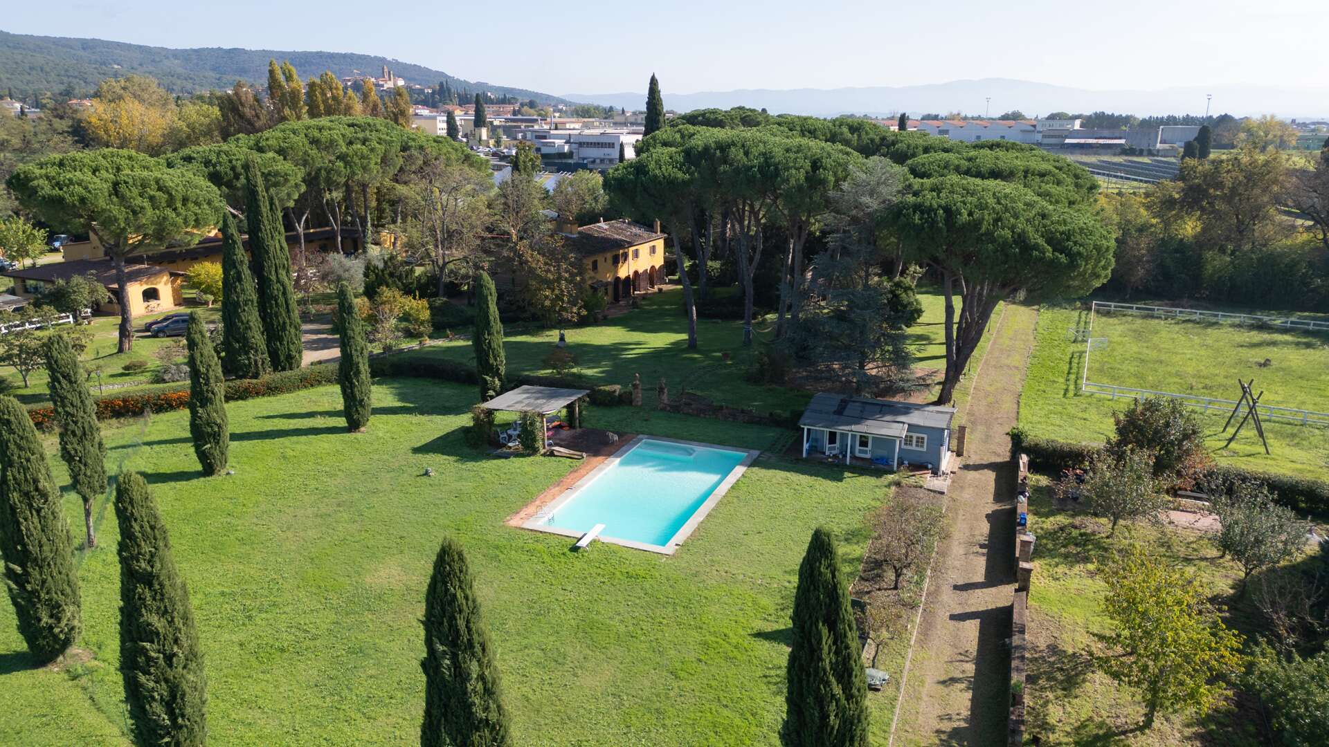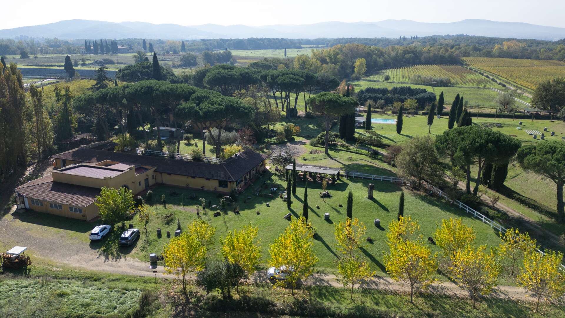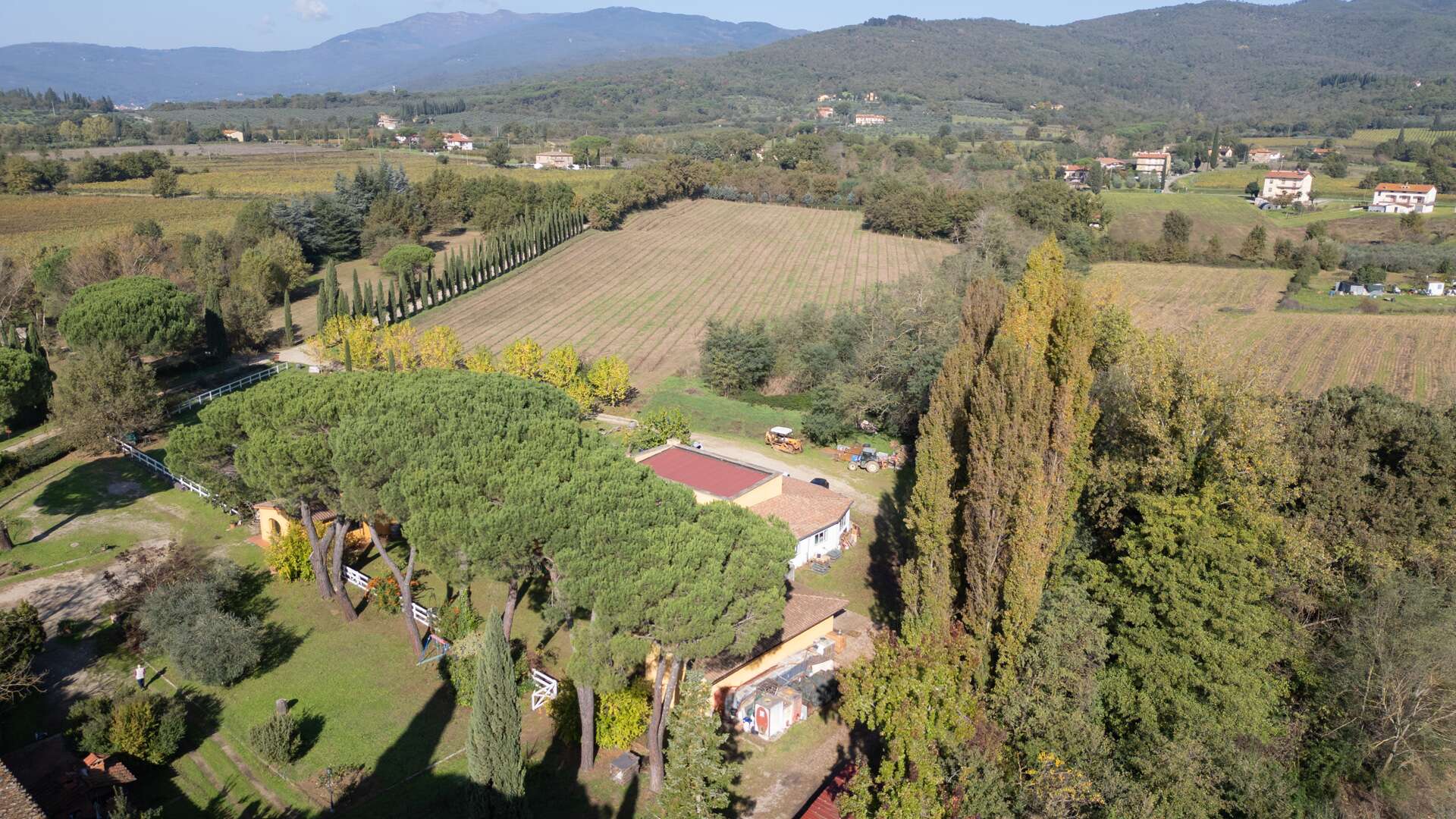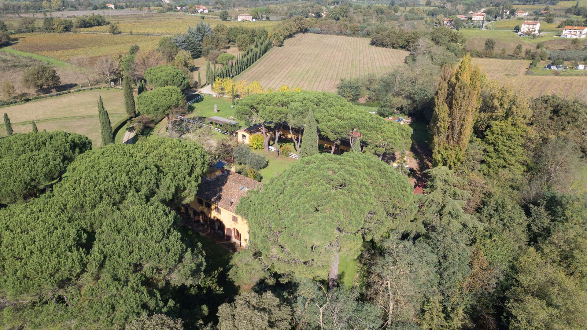 This historic farm awaits you in a picturesque corner of the Arno Valley, in Tuscany. The farmhouse dates to 1700, it has been carefully restored in 2009. The house is divided over two levels for a total living area of approximately 1,031 sqm. It is surrounded by a green area of over 31 hectares that includes a varied landscape of farmland, woods, gardens, and specialized vineyards. The outdoor area offers a harmonious environment with a swimming pool, surrounded by a well-kept garden, creating the ideal setting for days of relaxation and conviviality. The panoramic views of the surrounding countryside offer an atmosphere of tranquillity. The house has an independent entrance and can be easily reached via a paved road in less than 500 metres from the main entrance. The interior of the farmhouse features large reception areas, with historic rooms characterized by traditional architectural elements. The windows invite plenty of natural light and offer a view of the surrounding landscape. Where possible, the bedrooms could be equipped with en-suite bathrooms, ensuring comfort and privacy. Although the interior finishes show a satisfactory level of quality, the modern systems, such as water and heating, fall within a maintenance range of over 20 years. The elegant and functional stairs lead to the various levels of the house. Outside, there are spaces dedicated to the stabling and resting of horses, as well as an area that could potentially be used as a riding school. This property offers multiple opportunities, including the possibility of tourist and hospitality development, given its strategic position a short distance from touristic centres and historical attractions. The large garden and land offer opportunities for cultivation and outdoor activities, making the property ideal for those who wish to fully immerse themselves in nature and rural Tuscan life. The property is characterized by a high level of privacy and represents a unique opportunity for people seeking a haven of peace and history, with incredible development potential in a context of great historical and naturalistic value.