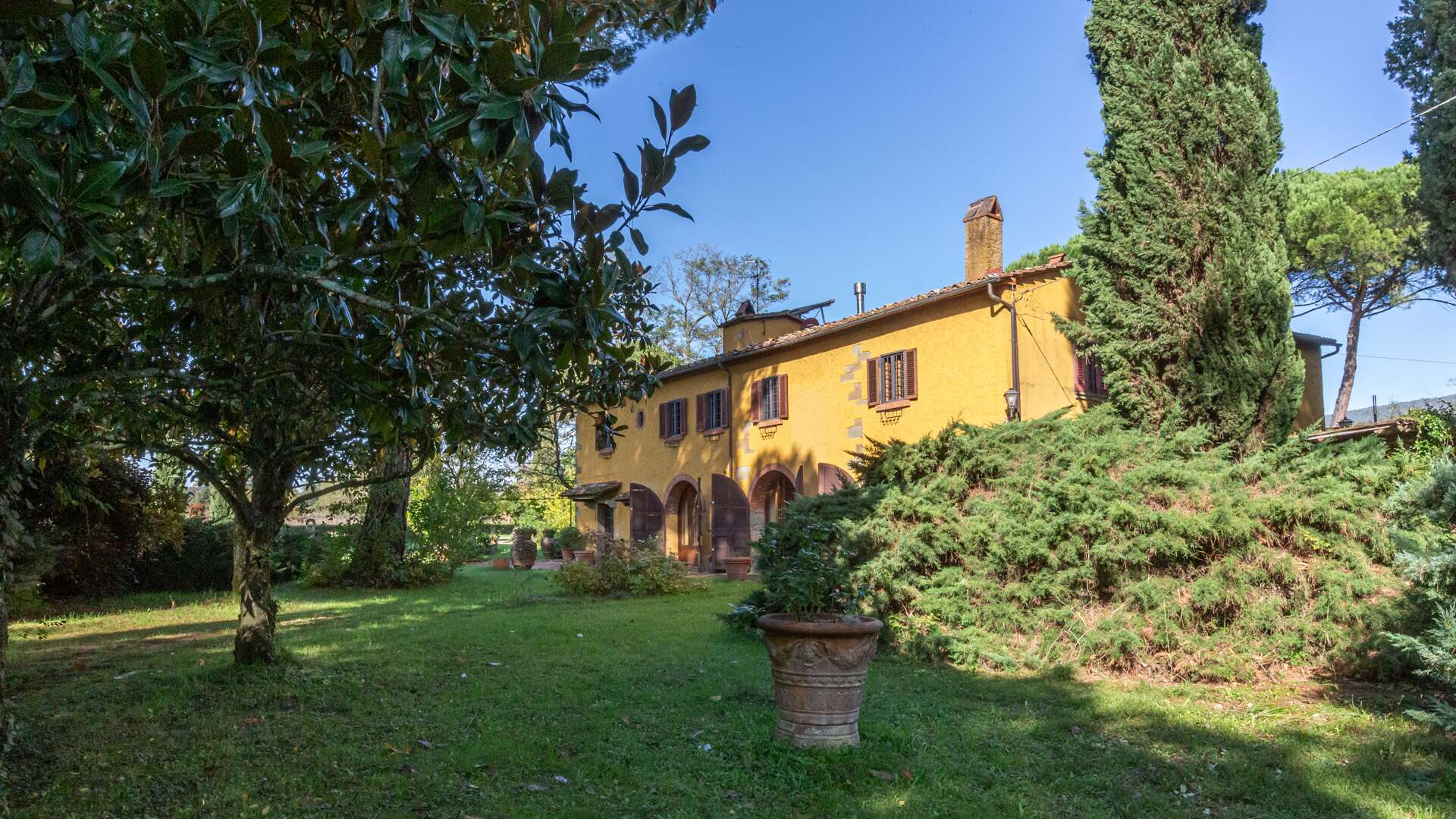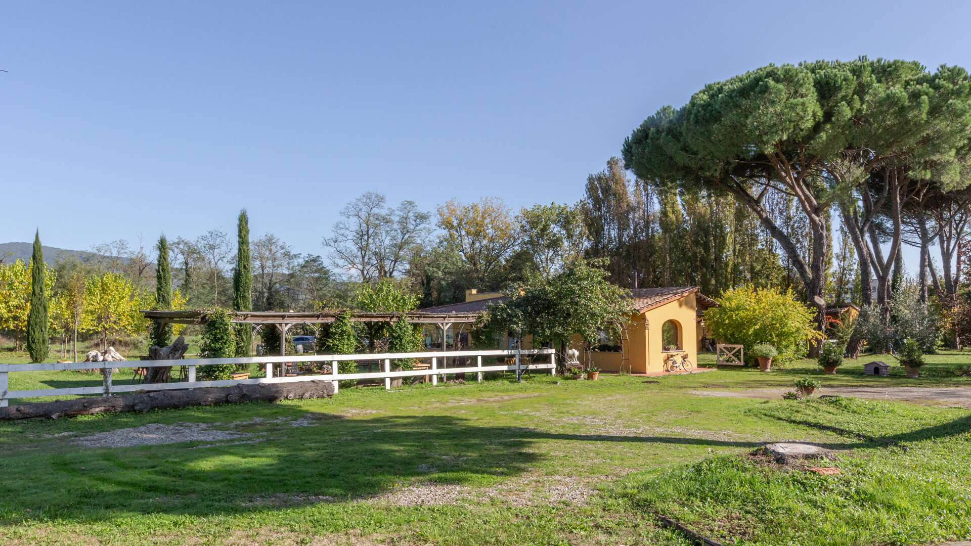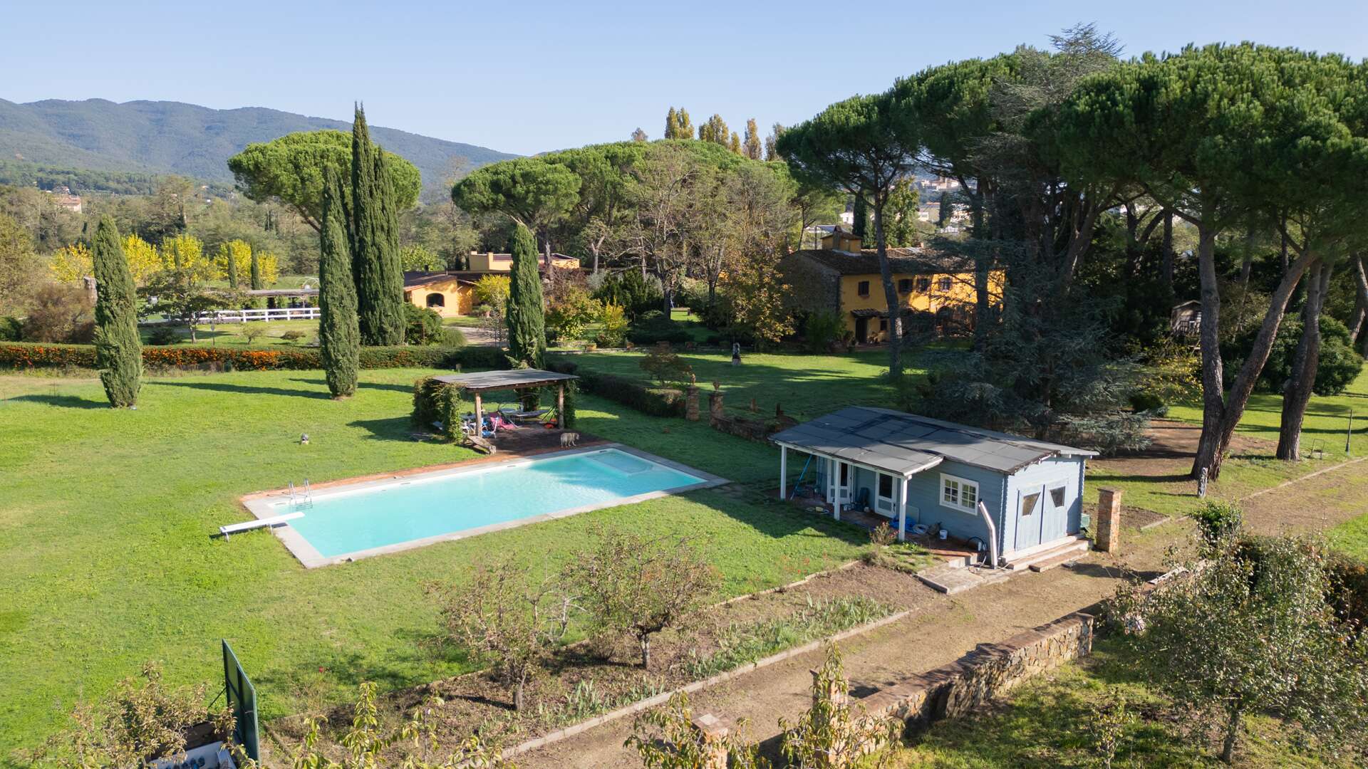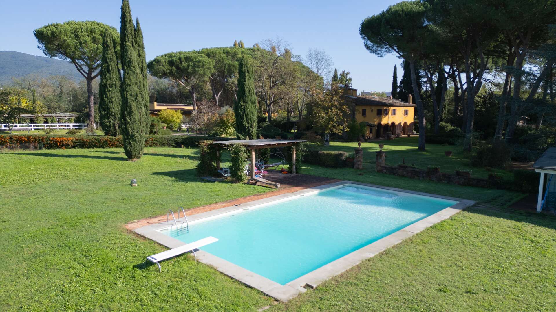 This historic farm awaits you in a picturesque corner of the Arno Valley, in Tuscany. The farmhouse dates to 1700, it has been carefully restored in 2009. The house is divided over two levels for a total living area of approximately 1,031 sqm. It is surrounded by a green area of over 31 hectares that includes a varied landscape of farmland, woods, gardens, and specialized vineyards. The outdoor area offers a harmonious environment with a swimming pool, surrounded by a well-kept garden, creating the ideal setting for days of relaxation and conviviality. The panoramic views of the surrounding countryside offer an atmosphere of tranquillity. The house has an independent entrance and can be easily reached via a paved road in less than 500 metres from the main entrance. The interior of the farmhouse features large reception areas, with historic rooms characterized by traditional architectural elements. The windows invite plenty of natural light and offer a view of the surrounding landscape. Where possible, the bedrooms could be equipped with en-suite bathrooms, ensuring comfort and privacy. Although the interior finishes show a satisfactory level of quality, the modern systems, such as water and heating, fall within a maintenance range of over 20 years. The elegant and functional stairs lead to the various levels of the house. Outside, there are spaces dedicated to the stabling and resting of horses, as well as an area that could potentially be used as a riding school. This property offers multiple opportunities, including the possibility of tourist and hospitality development, given its strategic position a short distance from touristic centres and historical attractions. The large garden and land offer opportunities for cultivation and outdoor activities, making the property ideal for those who wish to fully immerse themselves in nature and rural Tuscan life. The property is characterized by a high level of privacy and represents a unique opportunity for people seeking a haven of peace and history, with incredible development potential in a context of great historical and naturalistic value.