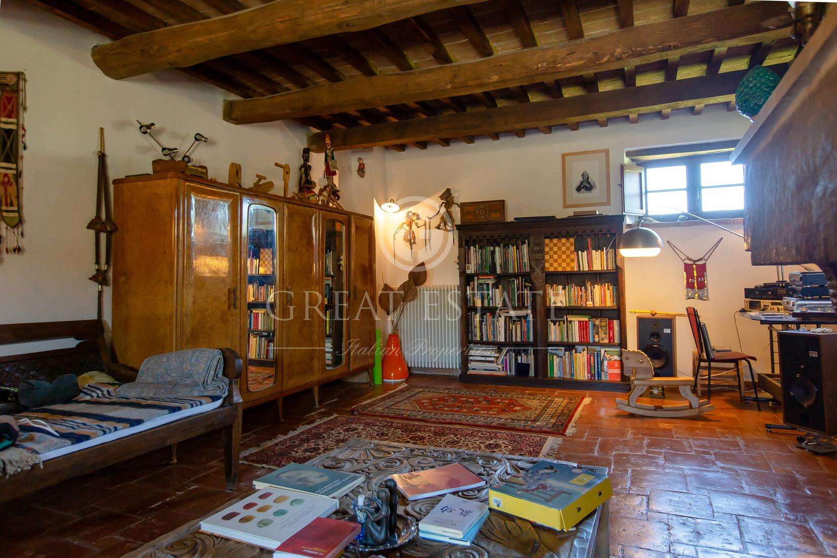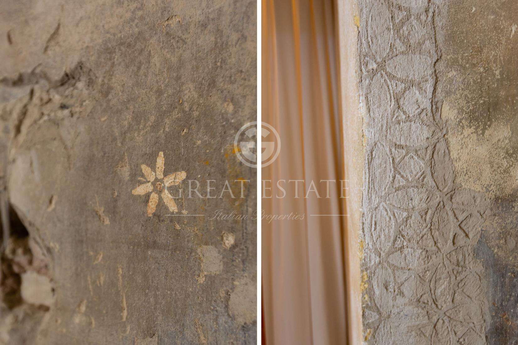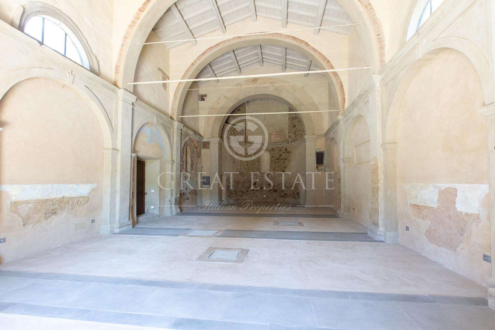 The entire property is about 1,000 square meters, fabulously restored in 2010. This unique farmhouse spans 3 levels. On the ground floor, you will find a stunning ancient staircase that leads to the second floor, featuring a charming terrace with stone columns, a kitchen with a wood oven, beautiful terracotta floors, and single-fired grit tiles, a living room dominated by an exquisite travertine thermo fireplace, a bedroom, and a bathroom. An external staircase provides access to the second floor, which includes a living room and four bedrooms with en-suite bathrooms. The third floor contains five bedrooms with en-suite bathrooms. The former tobacco drying house boasts a living room with a beautiful wood-burning fireplace, a dining area, a professional kitchen, another living area with windows and French doors opening onto the backyard, a bedroom, an additional kitchen, an anteroom and bathroom, a living room, and a hallway with direct access to the intricately restored deconsecrated church, which could serve as a multipurpose room. There is also a former sacristy, an anteroom, a service bathroom, and a boiler. Additionally, there is an annex divided into five external warehouses, alongside a guesthouse with a living room/kitchen, two bedrooms, and a bathroom. The stunning location and enchanting panorama offer the perfect opportunity to build a beautiful swimming pool. The land is primarily arable, encompassing about 5.5 hectares, along with approximately 1 hectare of pasture land.