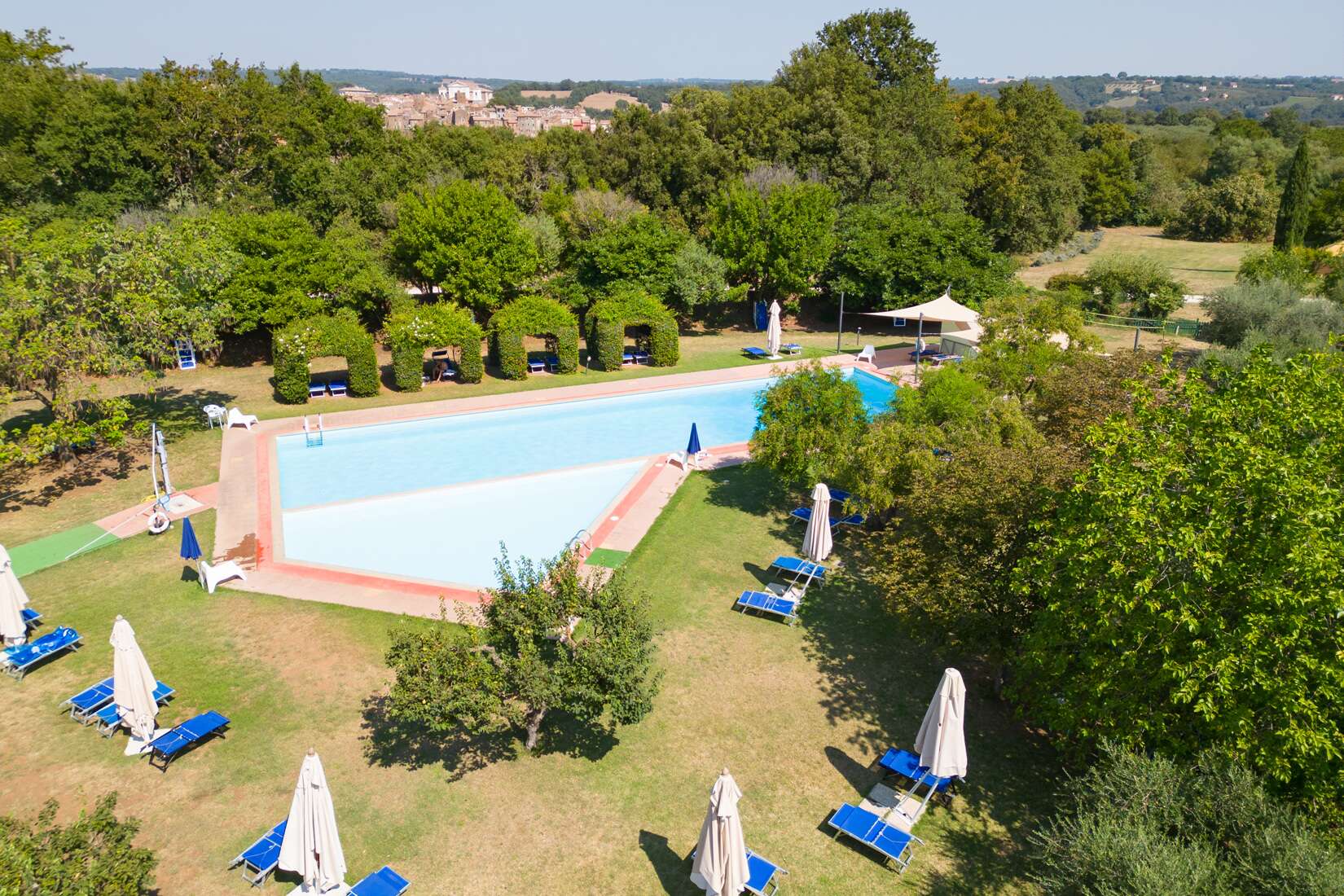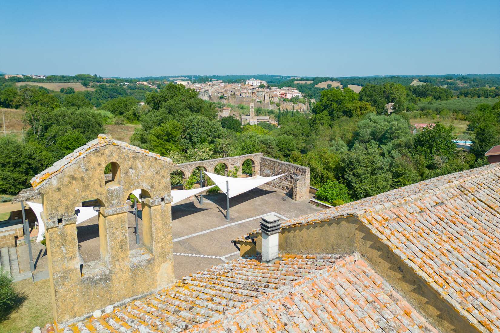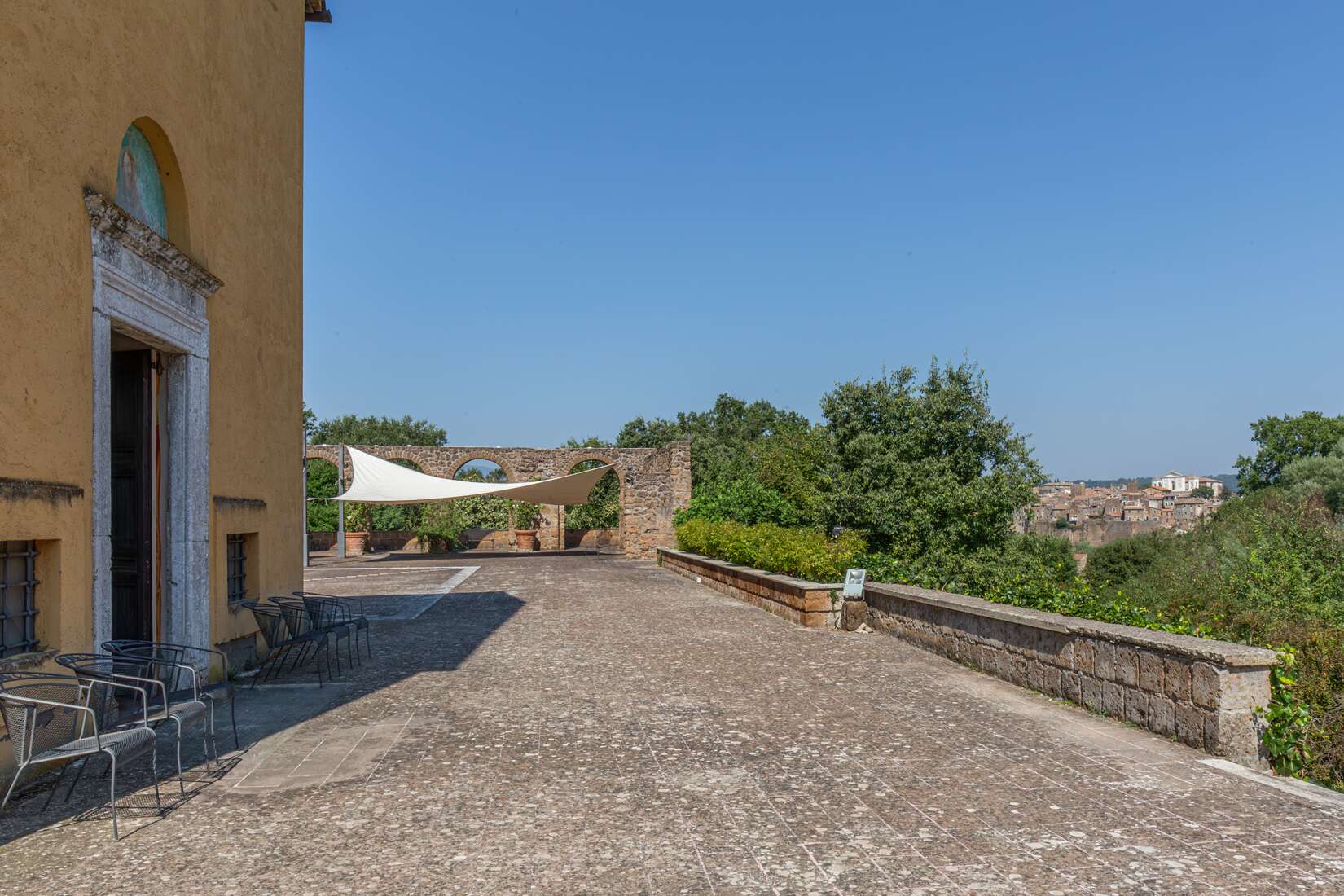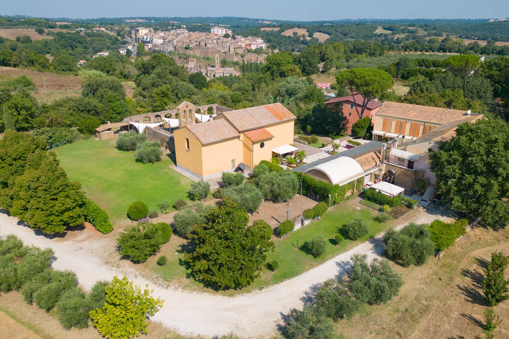 Country House Gallese is located on the site of an ancient convent. Today there are traces of the ancient walls, rich in history, a now deconsecrated 17th century church faced by the arches of the cloister and caves dating back to the Faliscan period. From here, surrounded by greenery, a splendid panorama extends over the surrounding landscape. A large space has been set up in the church, perfect for seminars, workshops, conferences or events. The villa houses seven bedrooms all with private bathroom and mezzanine, air conditioning and two independent apartments, a basement with apartment for the caretaker and utility rooms. A beautiful 4 ha garden, olive grove with 150 trees and orchard with 400 trees and a 10x20 m swimming pool with children's pool with bar, changing room and services.