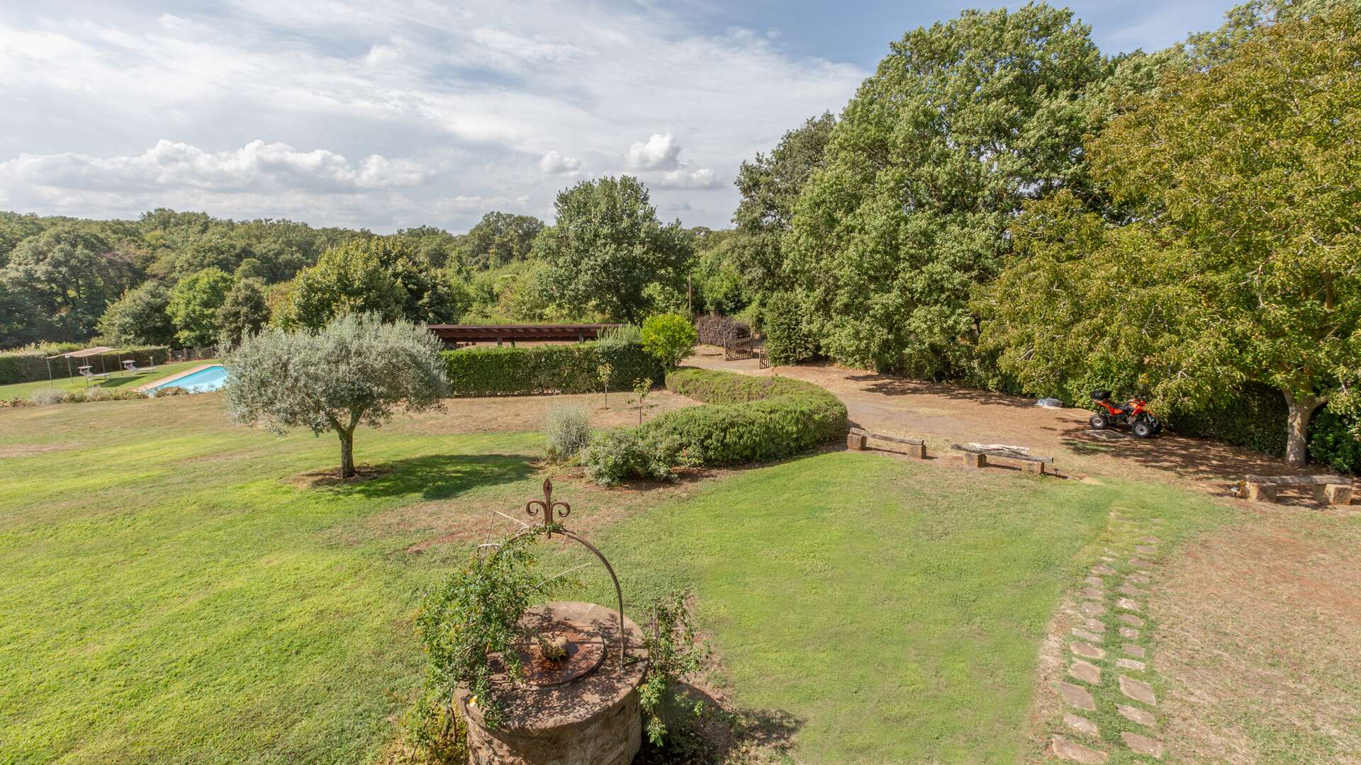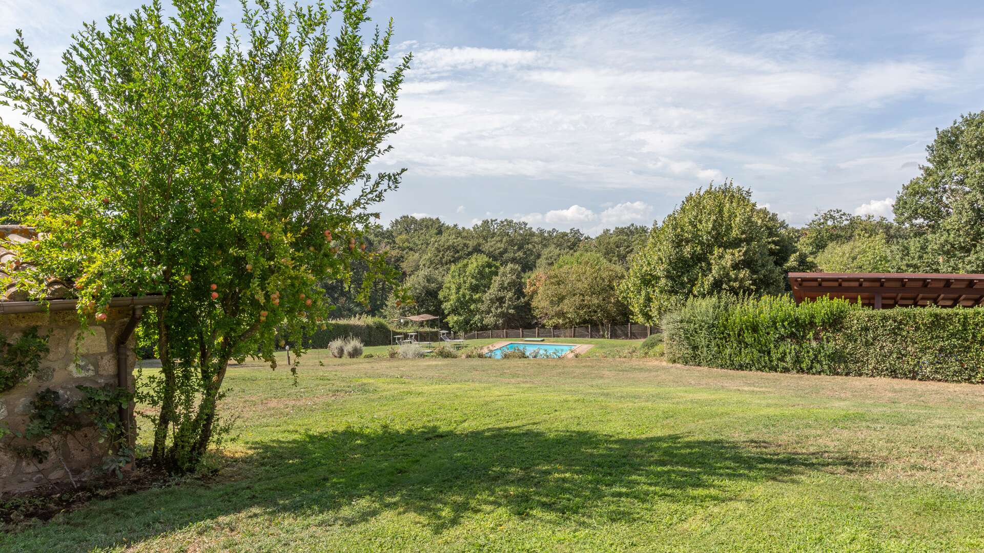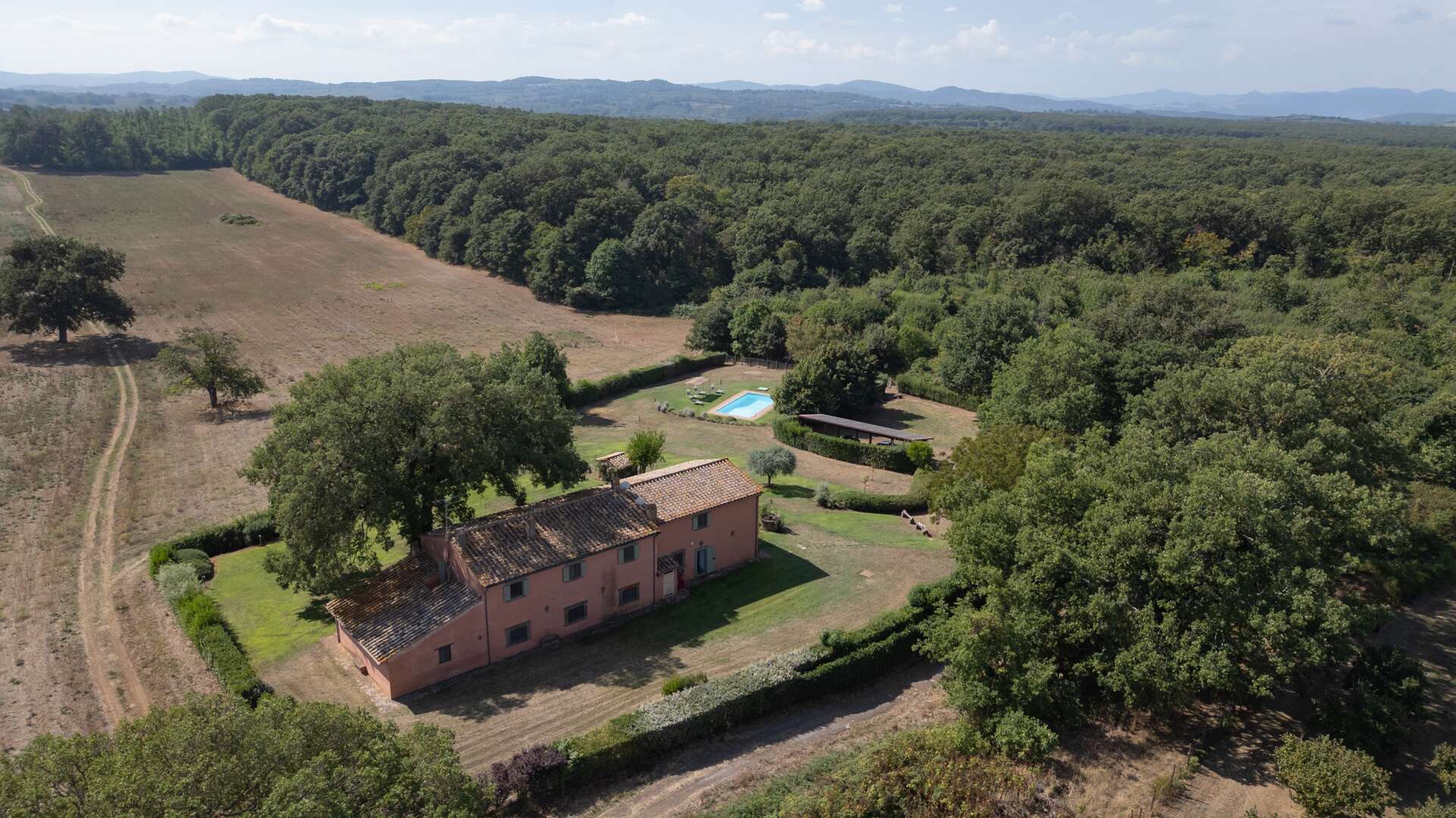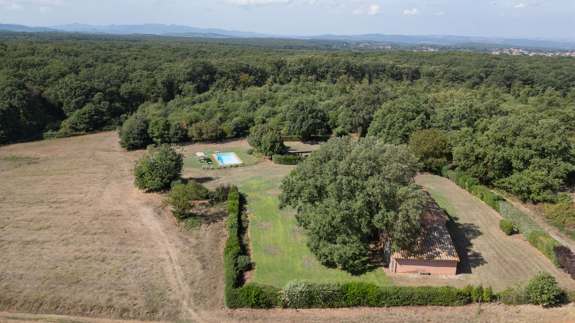 This farmhouse with swimming pool and park (including 1 hectare of land) was restored in 2000 and awaits you on the slopes of Mount Fogliano surrounded by unspoiled nature. The farmhouse is served by an ancient Roman cobblestone road – called "Basolato" – which, as you pass, recalls the clinking of carriages, to then arrive at a true oasis in the open countryside. The original farmhouse from 1700, once inhabited by a noble family of landowners, has functioned as a rural building, until in 2000 it was restored by the current owner and transformed into a holiday residence. It stands on approximately one hectare of land: about 5000 sqm of fenced garden and 5000 sqm of woodland. The residence is surrounded by chestnut and oak woods. The property is divided into two residential areas: over 400 cadastral square metres divided into two floors and a neighbouring apartment (currently under renovation) of approximately 60 sqm obtained from the old granary. The main farmhouse is divided as follows: on the ground floor, there are a large pergola, a spacious living room/dining area of approximately 100 sqm, a large kitchen complete with barbecue and fireplace, a pantry with service entrance, a bedroom as well as a bathroom. On the first floor, which is accessible via an internal and external polished stone staircase, there is a sleeping area with 4 very spacious double bedrooms with bathroom. The master bedroom features a walk-in closet and en-suite bathroom, a characteristic small terrace as well as closets and storage spaces. The small adjacent apartment offers a living area, a bedroom, and a bathroom (still under renovation). The outdoor area features a 5m x 10m swimming pool as well as a parking lot covered by a structure hosting 80 sqm of photovoltaic panels. The water comes from a 90 m deep well equipped with a purification system for the house. The same well also supplies the irrigation system and swimming pool. In the garden there is an old oven house that today is used as a shed for pool tools. Panorama of the countryside where the large and centuries-old oak tree that provides cool shade in the hot months and filters wonderful views and suggestive rays of sunshine.