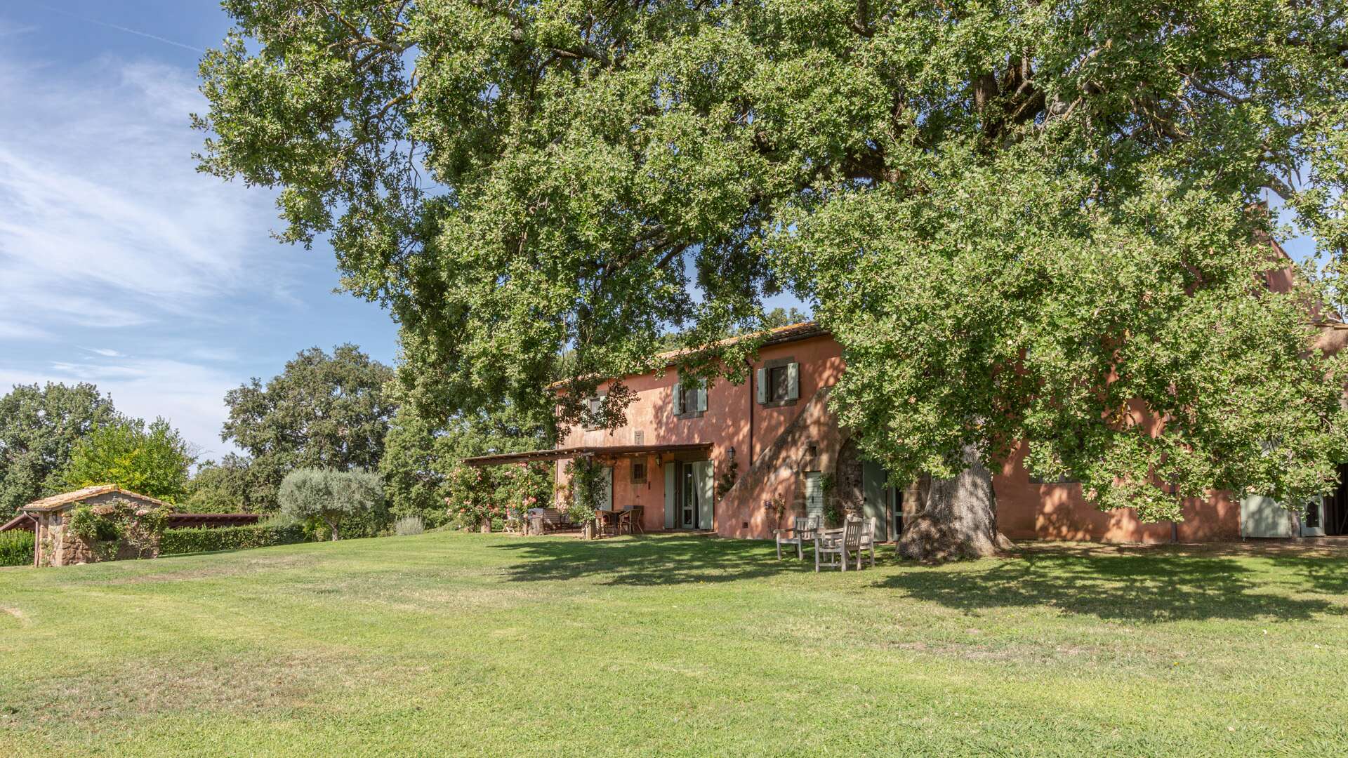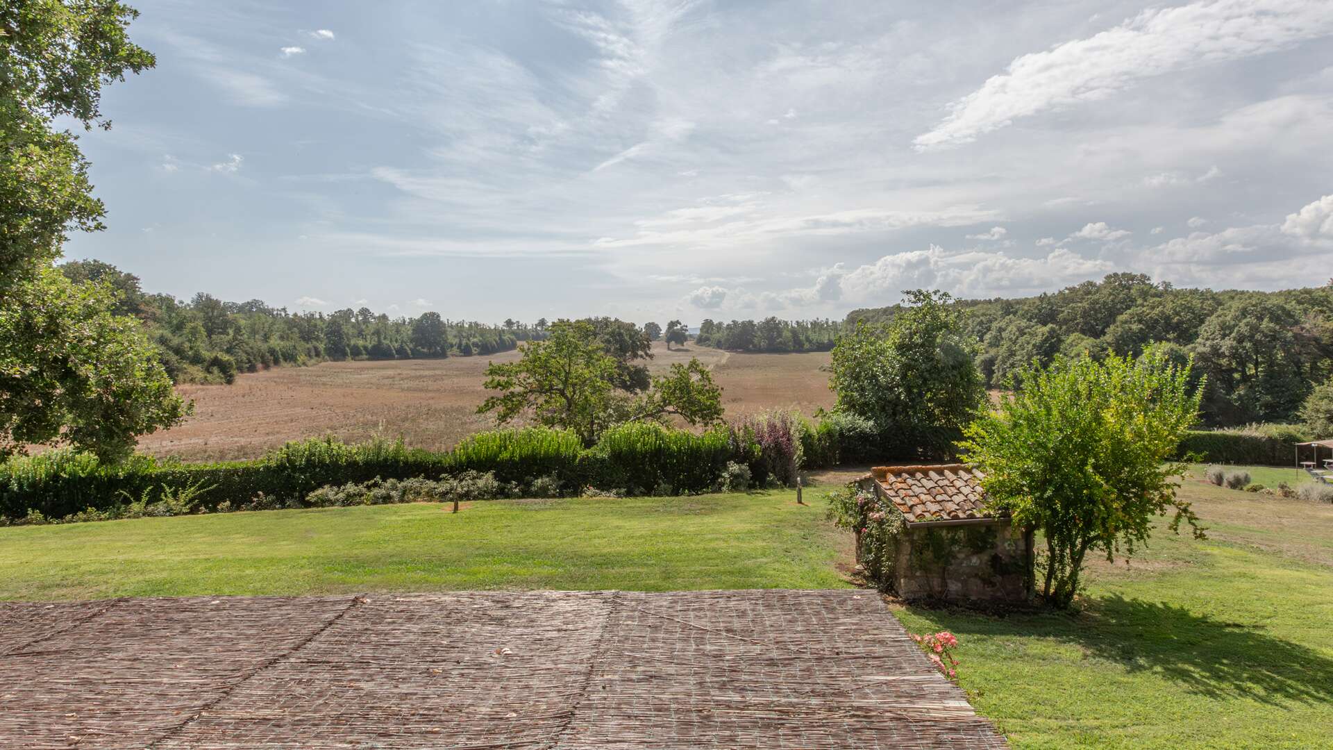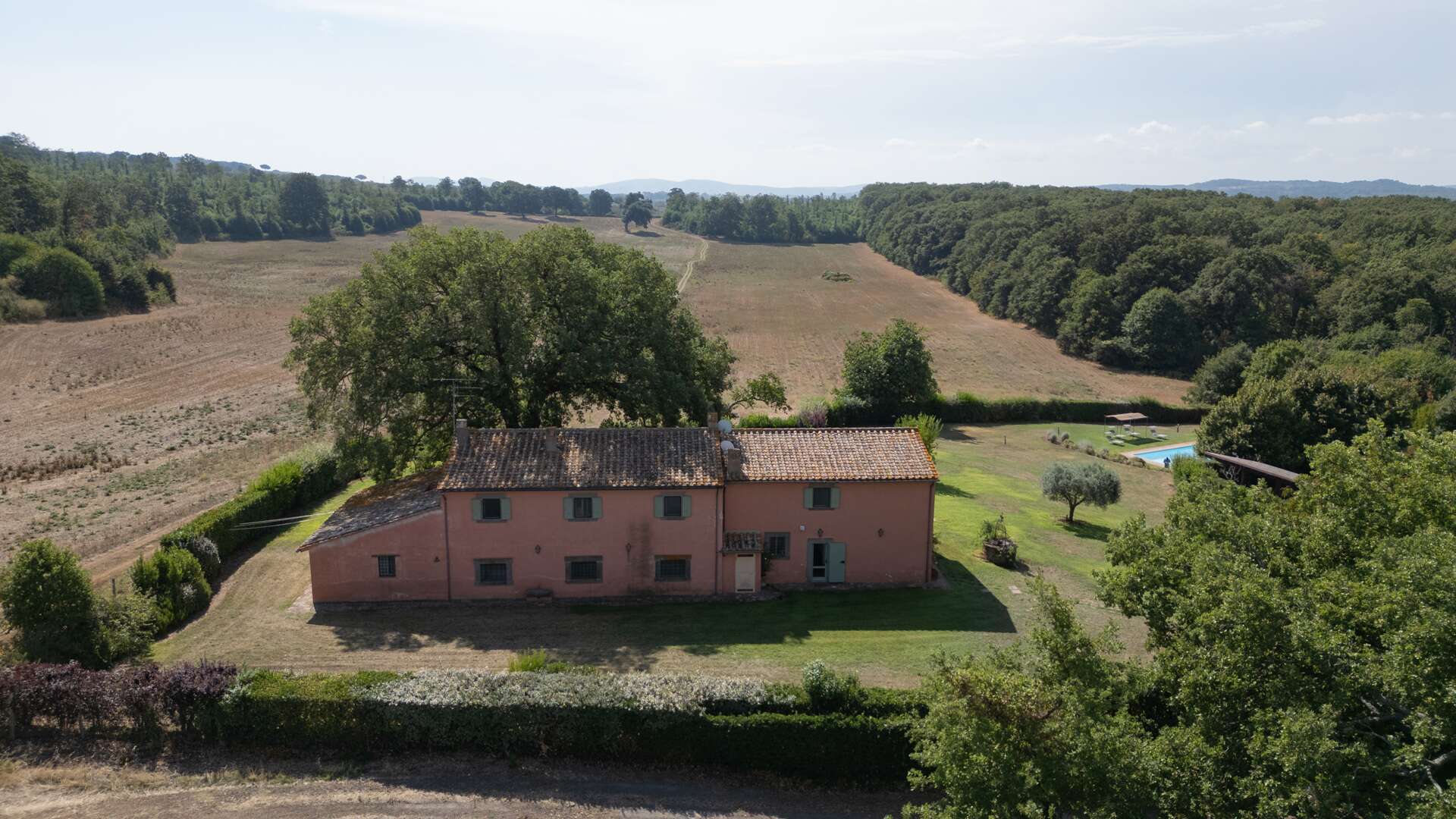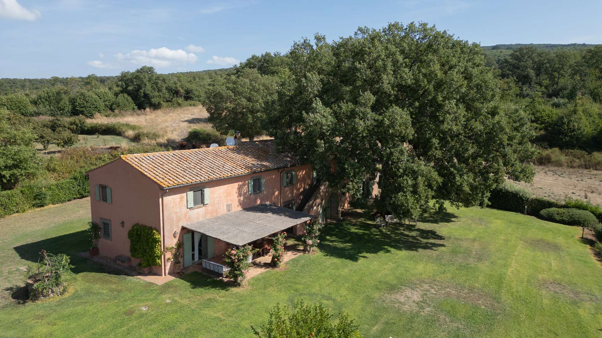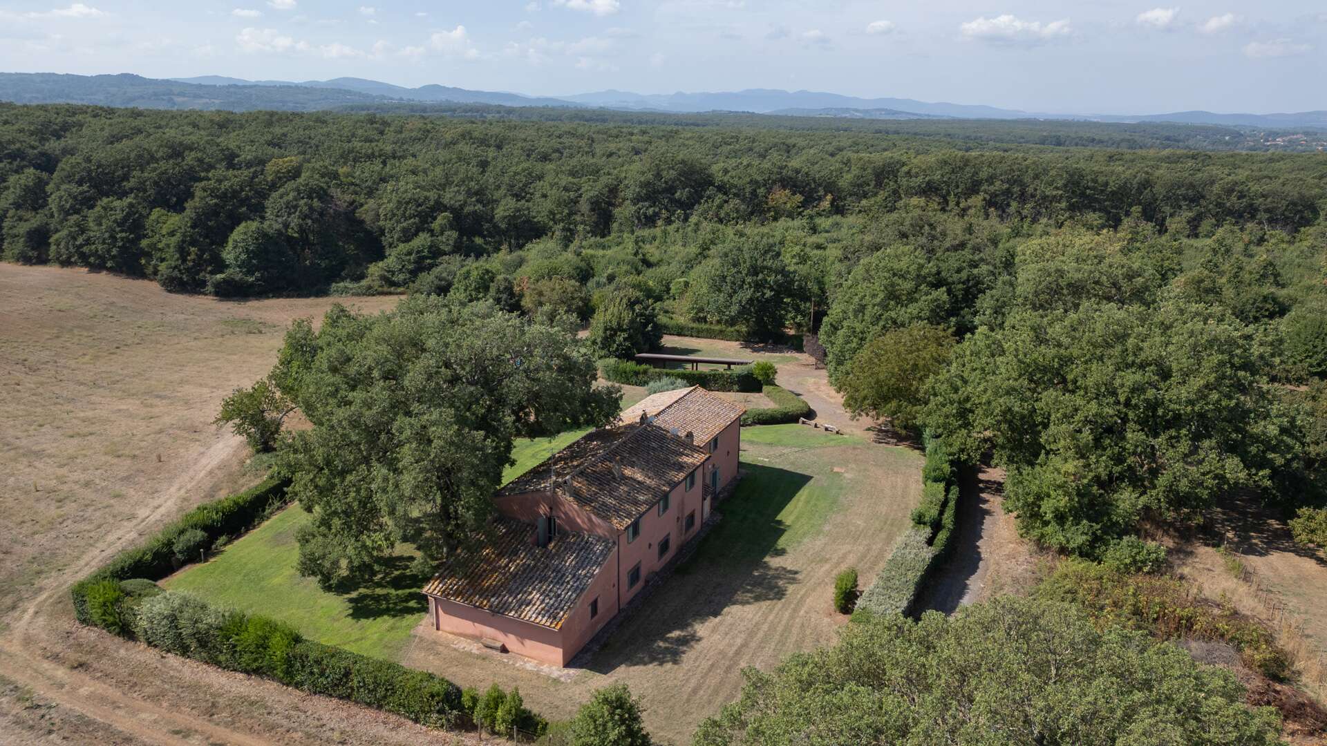 This farmhouse with swimming pool and park (including 1 hectare of land) was restored in 2000 and awaits you on the slopes of Mount Fogliano surrounded by unspoiled nature. The farmhouse is served by an ancient Roman cobblestone road – called "Basolato" – which, as you pass, recalls the clinking of carriages, to then arrive at a true oasis in the open countryside. The original farmhouse from 1700, once inhabited by a noble family of landowners, has functioned as a rural building, until in 2000 it was restored by the current owner and transformed into a holiday residence. It stands on approximately one hectare of land: about 5000 sqm of fenced garden and 5000 sqm of woodland. The residence is surrounded by chestnut and oak woods. The property is divided into two residential areas: over 400 cadastral square metres divided into two floors and a neighbouring apartment (currently under renovation) of approximately 60 sqm obtained from the old granary. The main farmhouse is divided as follows: on the ground floor, there are a large pergola, a spacious living room/dining area of approximately 100 sqm, a large kitchen complete with barbecue and fireplace, a pantry with service entrance, a bedroom as well as a bathroom. On the first floor, which is accessible via an internal and external polished stone staircase, there is a sleeping area with 4 very spacious double bedrooms with bathroom. The master bedroom features a walk-in closet and en-suite bathroom, a characteristic small terrace as well as closets and storage spaces. The small adjacent apartment offers a living area, a bedroom, and a bathroom (still under renovation). The outdoor area features a 5m x 10m swimming pool as well as a parking lot covered by a structure hosting 80 sqm of photovoltaic panels. The water comes from a 90 m deep well equipped with a purification system for the house. The same well also supplies the irrigation system and swimming pool. In the garden there is an old oven house that today is used as a shed for pool tools. Panorama of the countryside where the large and centuries-old oak tree that provides cool shade in the hot months and filters wonderful views and suggestive rays of sunshine.