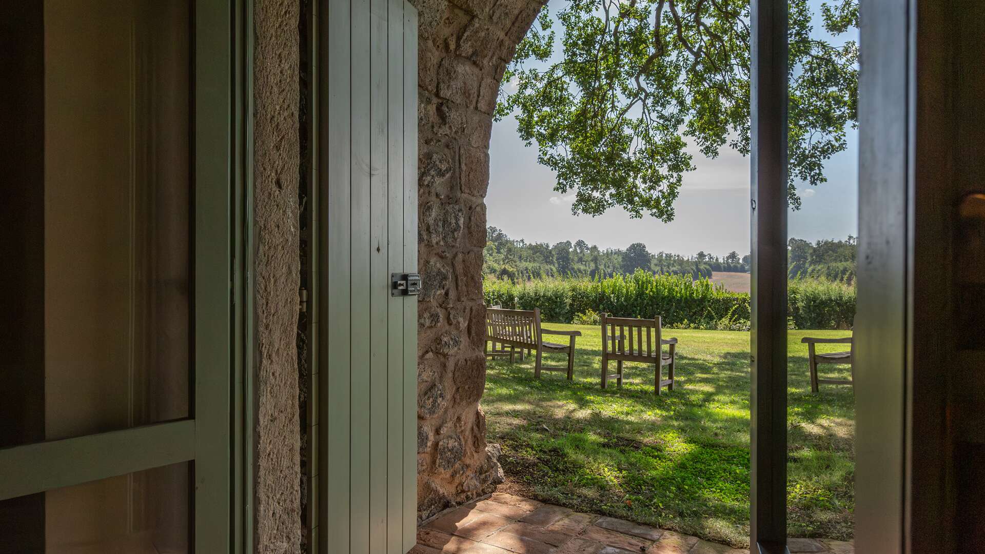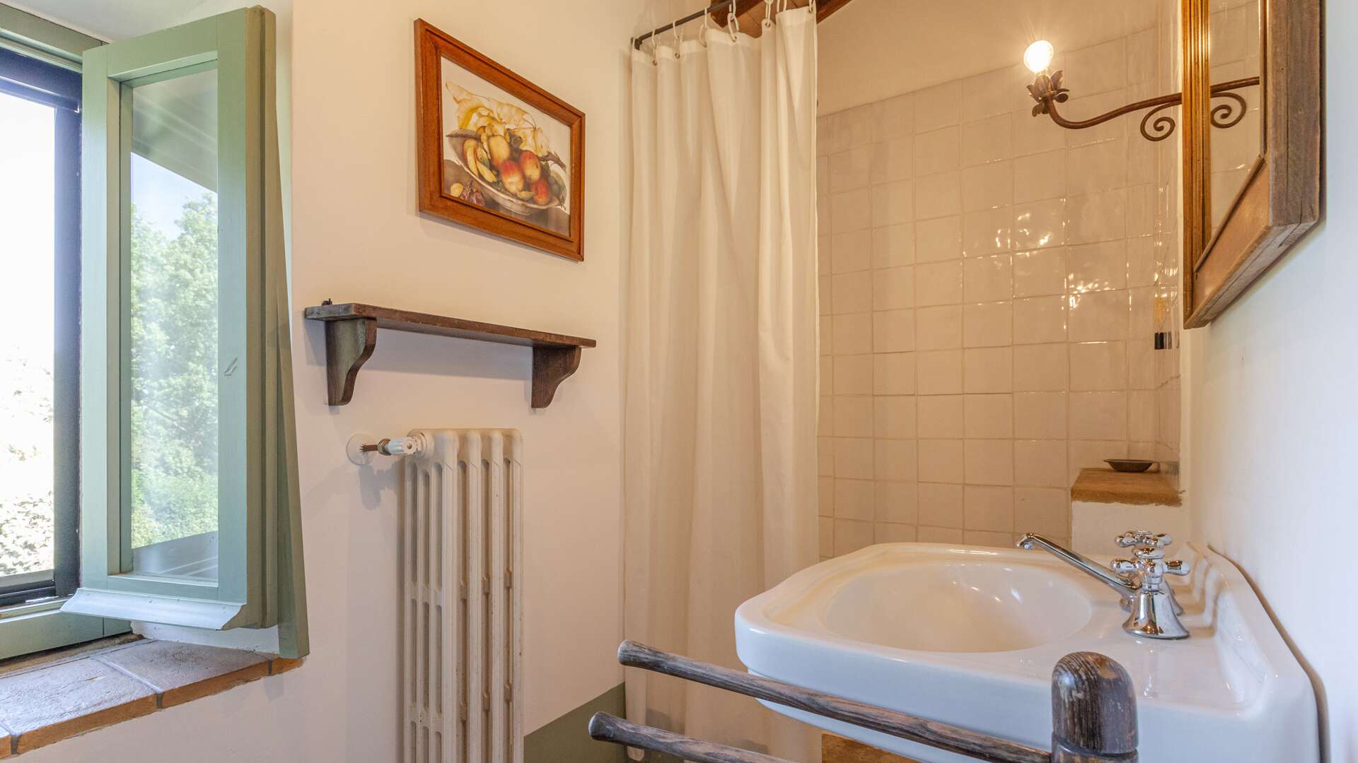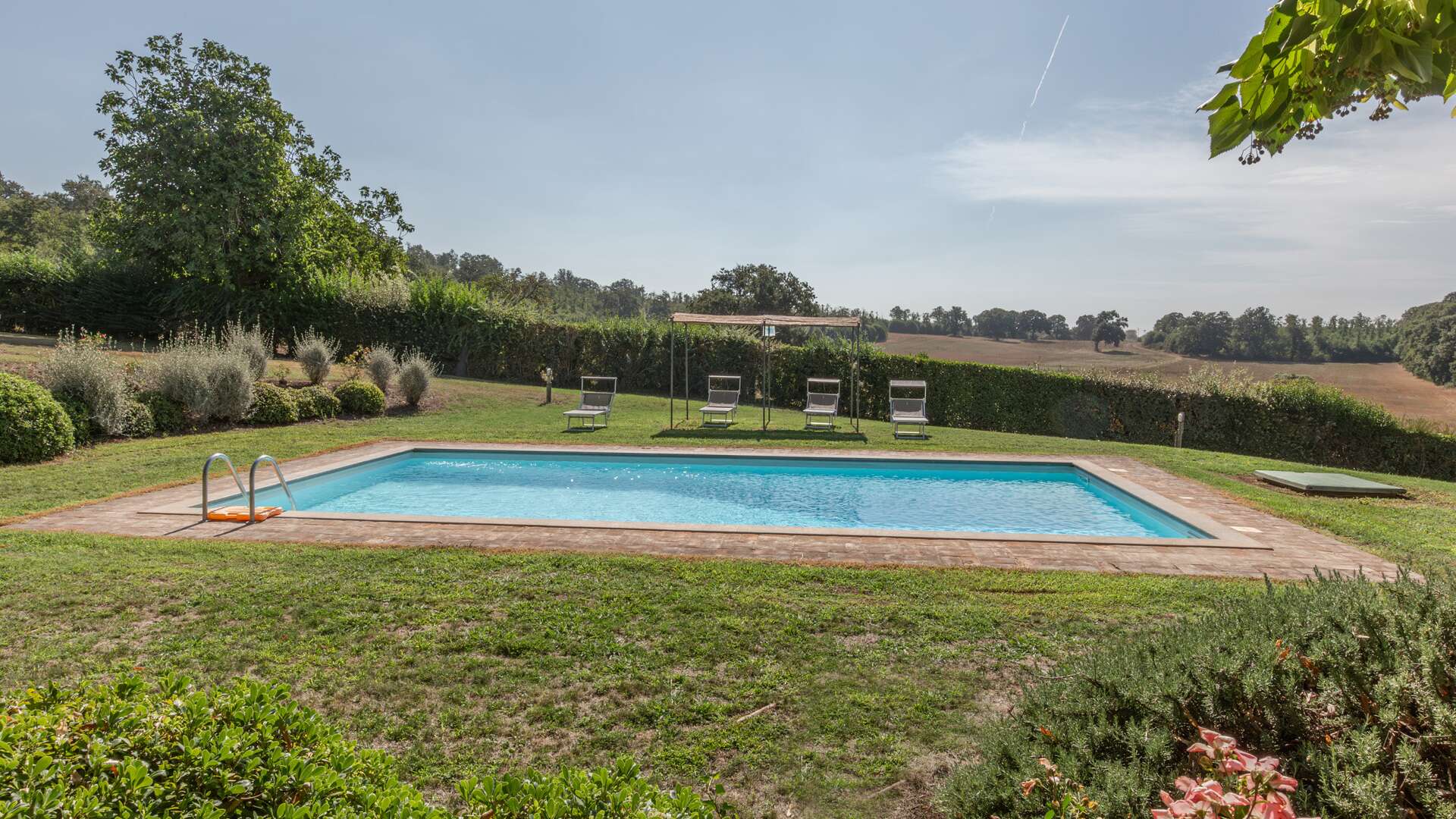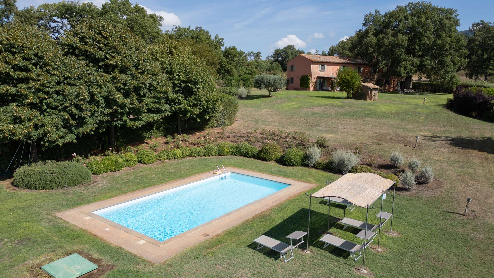 This farmhouse with swimming pool and park (including 1 hectare of land) was restored in 2000 and awaits you on the slopes of Mount Fogliano surrounded by unspoiled nature. The farmhouse is served by an ancient Roman cobblestone road – called "Basolato" – which, as you pass, recalls the clinking of carriages, to then arrive at a true oasis in the open countryside. The original farmhouse from 1700, once inhabited by a noble family of landowners, has functioned as a rural building, until in 2000 it was restored by the current owner and transformed into a holiday residence. It stands on approximately one hectare of land: about 5000 sqm of fenced garden and 5000 sqm of woodland. The residence is surrounded by chestnut and oak woods. The property is divided into two residential areas: over 400 cadastral square metres divided into two floors and a neighbouring apartment (currently under renovation) of approximately 60 sqm obtained from the old granary. The main farmhouse is divided as follows: on the ground floor, there are a large pergola, a spacious living room/dining area of approximately 100 sqm, a large kitchen complete with barbecue and fireplace, a pantry with service entrance, a bedroom as well as a bathroom. On the first floor, which is accessible via an internal and external polished stone staircase, there is a sleeping area with 4 very spacious double bedrooms with bathroom. The master bedroom features a walk-in closet and en-suite bathroom, a characteristic small terrace as well as closets and storage spaces. The small adjacent apartment offers a living area, a bedroom, and a bathroom (still under renovation). The outdoor area features a 5m x 10m swimming pool as well as a parking lot covered by a structure hosting 80 sqm of photovoltaic panels. The water comes from a 90 m deep well equipped with a purification system for the house. The same well also supplies the irrigation system and swimming pool. In the garden there is an old oven house that today is used as a shed for pool tools. Panorama of the countryside where the large and centuries-old oak tree that provides cool shade in the hot months and filters wonderful views and suggestive rays of sunshine.