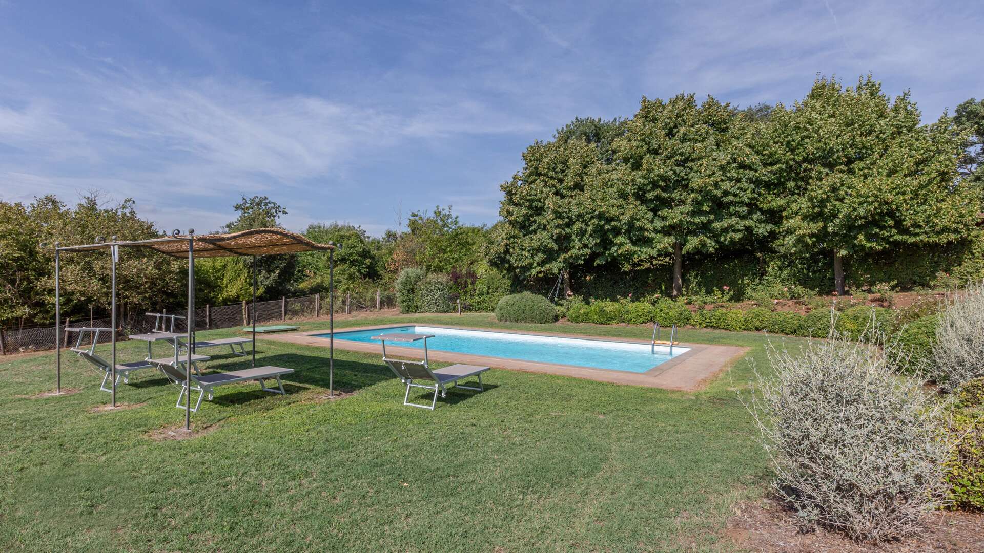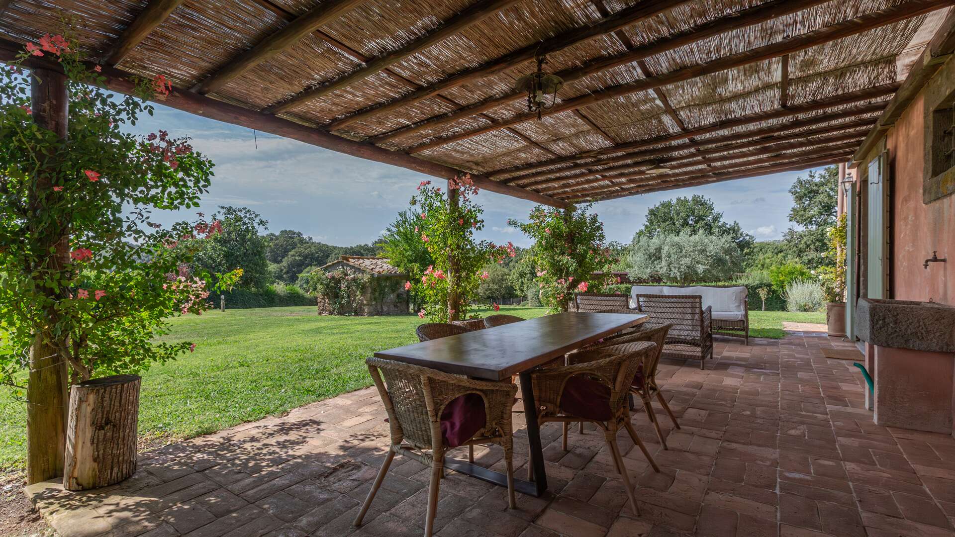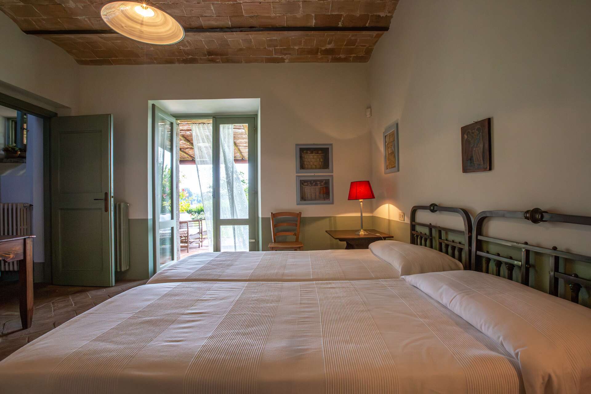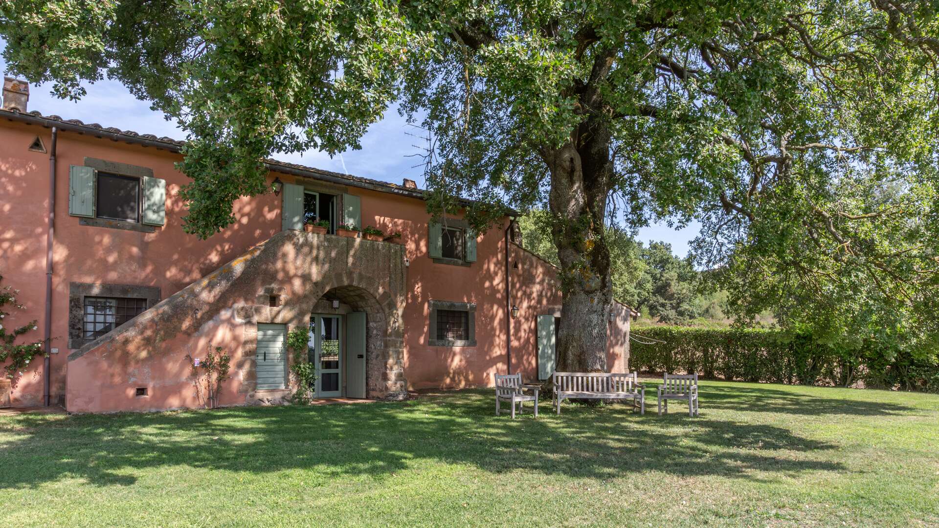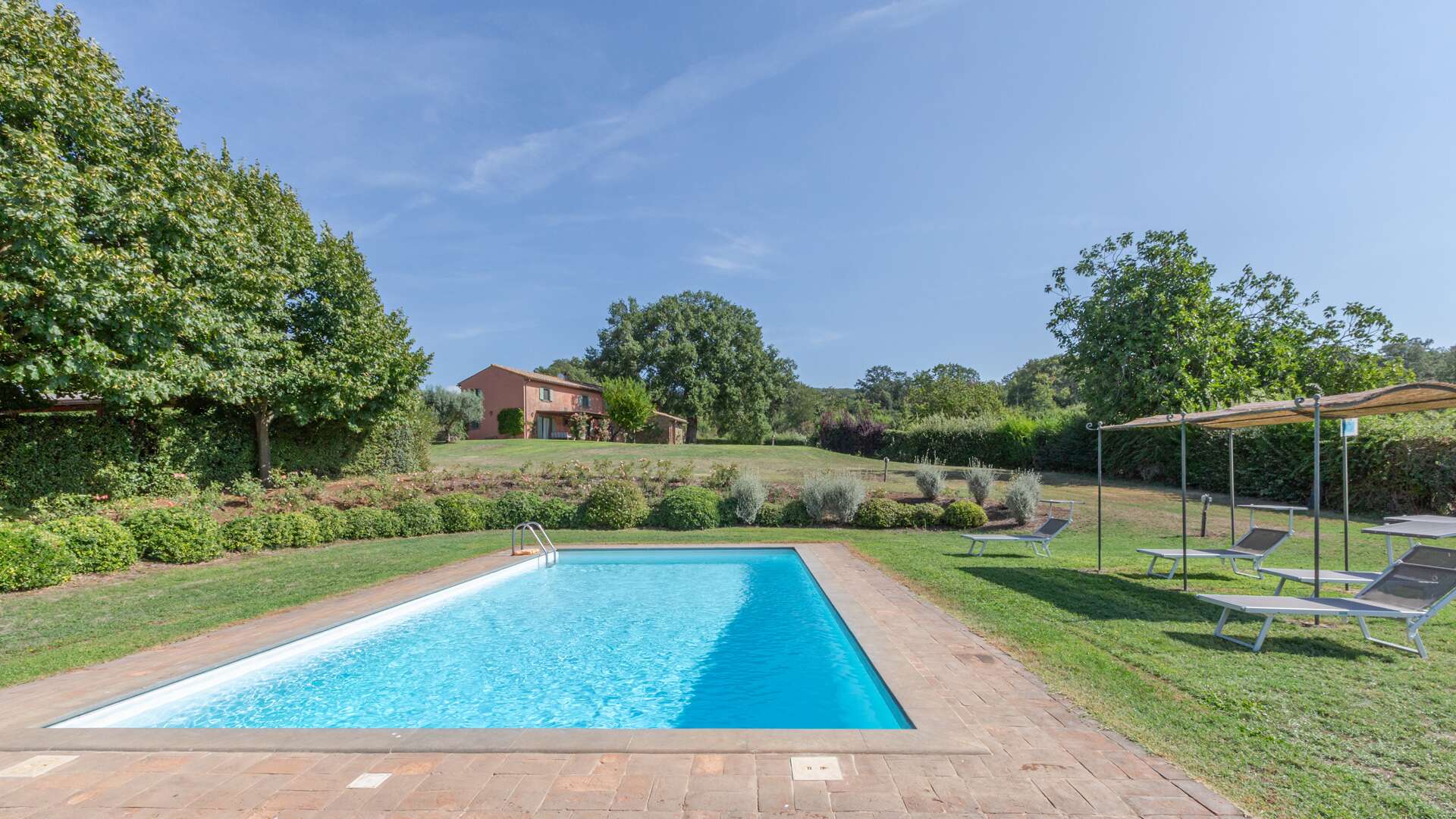 This farmhouse with swimming pool and park (including 1 hectare of land) was restored in 2000 and awaits you on the slopes of Mount Fogliano surrounded by unspoiled nature. The farmhouse is served by an ancient Roman cobblestone road – called "Basolato" – which, as you pass, recalls the clinking of carriages, to then arrive at a true oasis in the open countryside. The original farmhouse from 1700, once inhabited by a noble family of landowners, has functioned as a rural building, until in 2000 it was restored by the current owner and transformed into a holiday residence. It stands on approximately one hectare of land: about 5000 sqm of fenced garden and 5000 sqm of woodland. The residence is surrounded by chestnut and oak woods. The property is divided into two residential areas: over 400 cadastral square metres divided into two floors and a neighbouring apartment (currently under renovation) of approximately 60 sqm obtained from the old granary. The main farmhouse is divided as follows: on the ground floor, there are a large pergola, a spacious living room/dining area of approximately 100 sqm, a large kitchen complete with barbecue and fireplace, a pantry with service entrance, a bedroom as well as a bathroom. On the first floor, which is accessible via an internal and external polished stone staircase, there is a sleeping area with 4 very spacious double bedrooms with bathroom. The master bedroom features a walk-in closet and en-suite bathroom, a characteristic small terrace as well as closets and storage spaces. The small adjacent apartment offers a living area, a bedroom, and a bathroom (still under renovation). The outdoor area features a 5m x 10m swimming pool as well as a parking lot covered by a structure hosting 80 sqm of photovoltaic panels. The water comes from a 90 m deep well equipped with a purification system for the house. The same well also supplies the irrigation system and swimming pool. In the garden there is an old oven house that today is used as a shed for pool tools. Panorama of the countryside where the large and centuries-old oak tree that provides cool shade in the hot months and filters wonderful views and suggestive rays of sunshine.