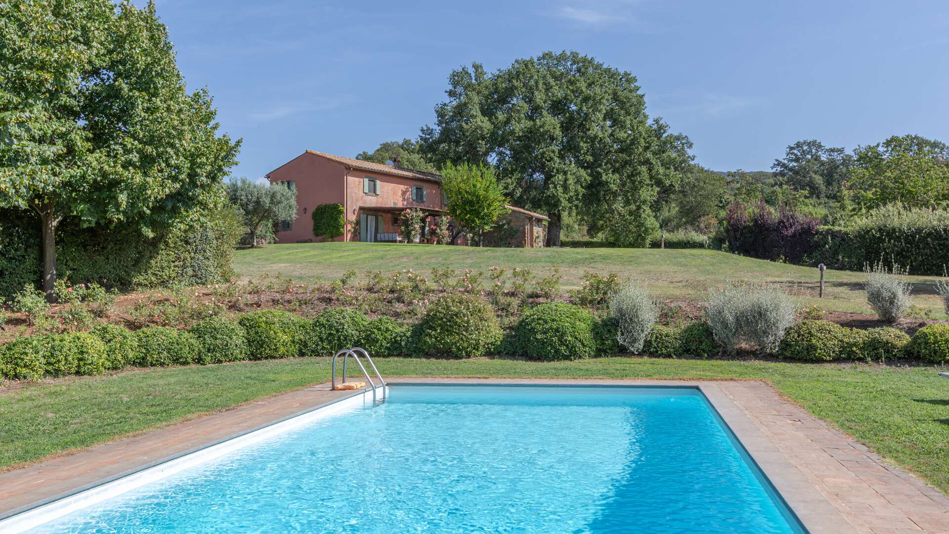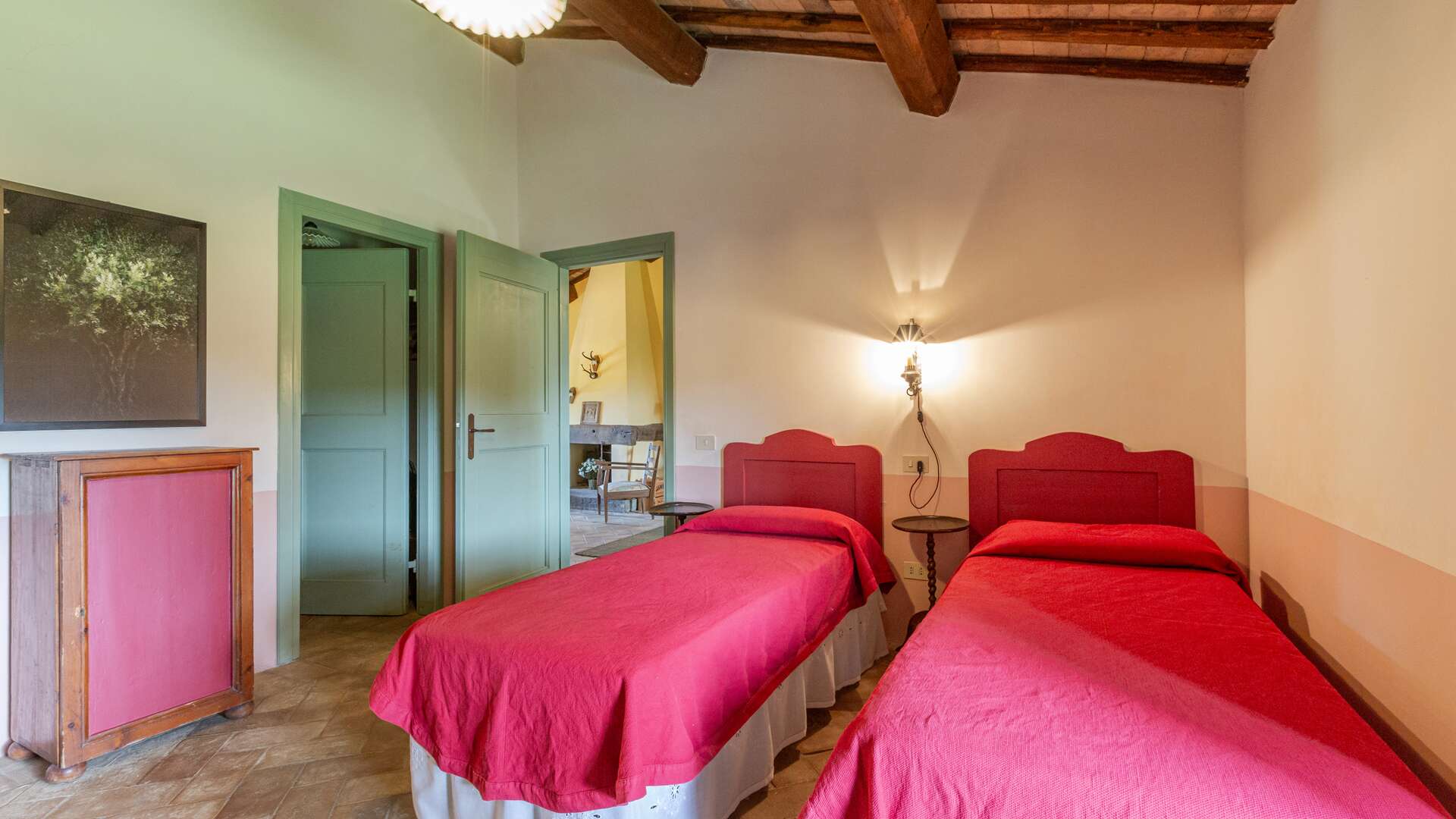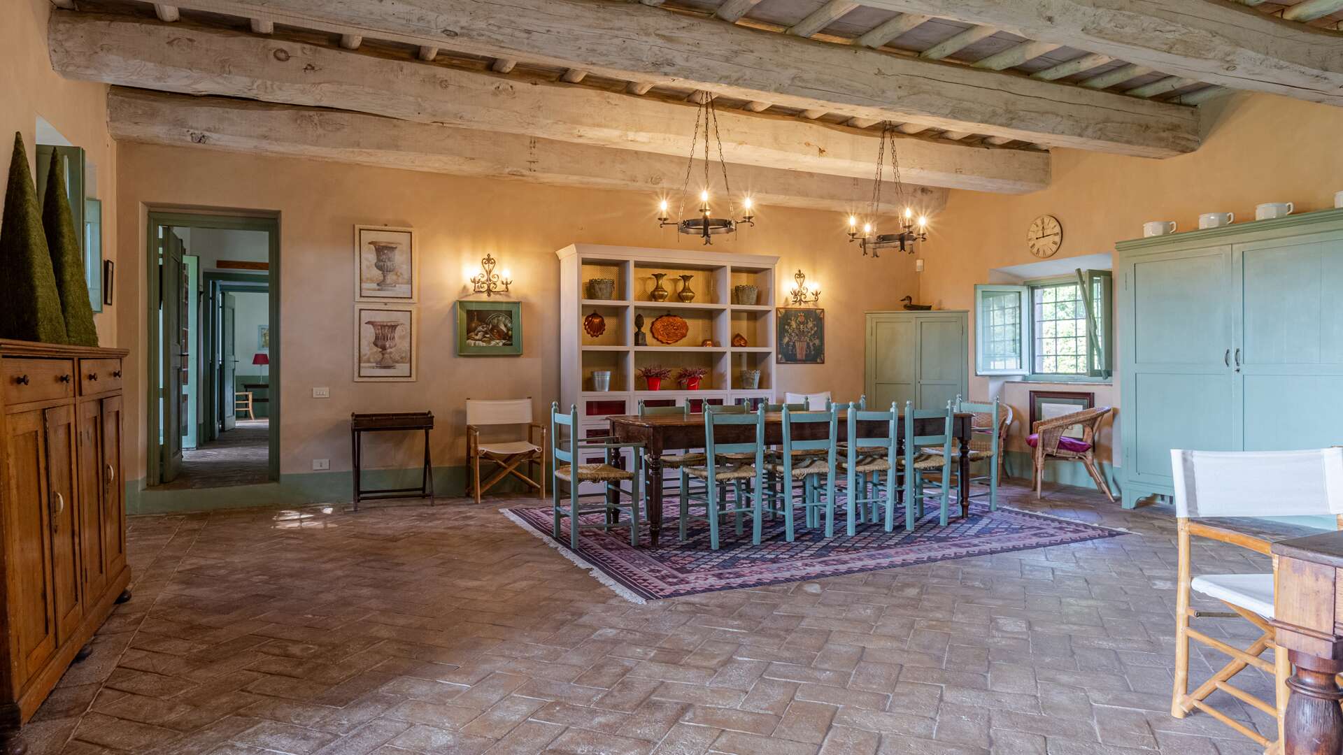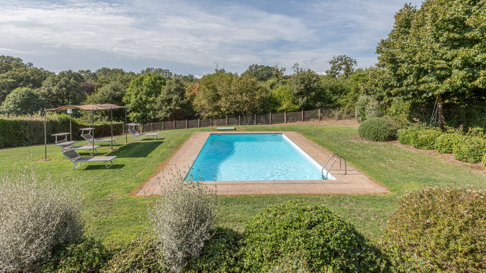 This farmhouse with swimming pool and park (including 1 hectare of land) was restored in 2000 and awaits you on the slopes of Mount Fogliano surrounded by unspoiled nature. The farmhouse is served by an ancient Roman cobblestone road – called "Basolato" – which, as you pass, recalls the clinking of carriages, to then arrive at a true oasis in the open countryside. The original farmhouse from 1700, once inhabited by a noble family of landowners, has functioned as a rural building, until in 2000 it was restored by the current owner and transformed into a holiday residence. It stands on approximately one hectare of land: about 5000 sqm of fenced garden and 5000 sqm of woodland. The residence is surrounded by chestnut and oak woods. The property is divided into two residential areas: over 400 cadastral square metres divided into two floors and a neighbouring apartment (currently under renovation) of approximately 60 sqm obtained from the old granary. The main farmhouse is divided as follows: on the ground floor, there are a large pergola, a spacious living room/dining area of approximately 100 sqm, a large kitchen complete with barbecue and fireplace, a pantry with service entrance, a bedroom as well as a bathroom. On the first floor, which is accessible via an internal and external polished stone staircase, there is a sleeping area with 4 very spacious double bedrooms with bathroom. The master bedroom features a walk-in closet and en-suite bathroom, a characteristic small terrace as well as closets and storage spaces. The small adjacent apartment offers a living area, a bedroom, and a bathroom (still under renovation). The outdoor area features a 5m x 10m swimming pool as well as a parking lot covered by a structure hosting 80 sqm of photovoltaic panels. The water comes from a 90 m deep well equipped with a purification system for the house. The same well also supplies the irrigation system and swimming pool. In the garden there is an old oven house that today is used as a shed for pool tools. Panorama of the countryside where the large and centuries-old oak tree that provides cool shade in the hot months and filters wonderful views and suggestive rays of sunshine.