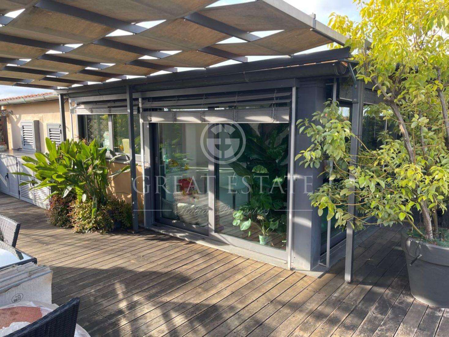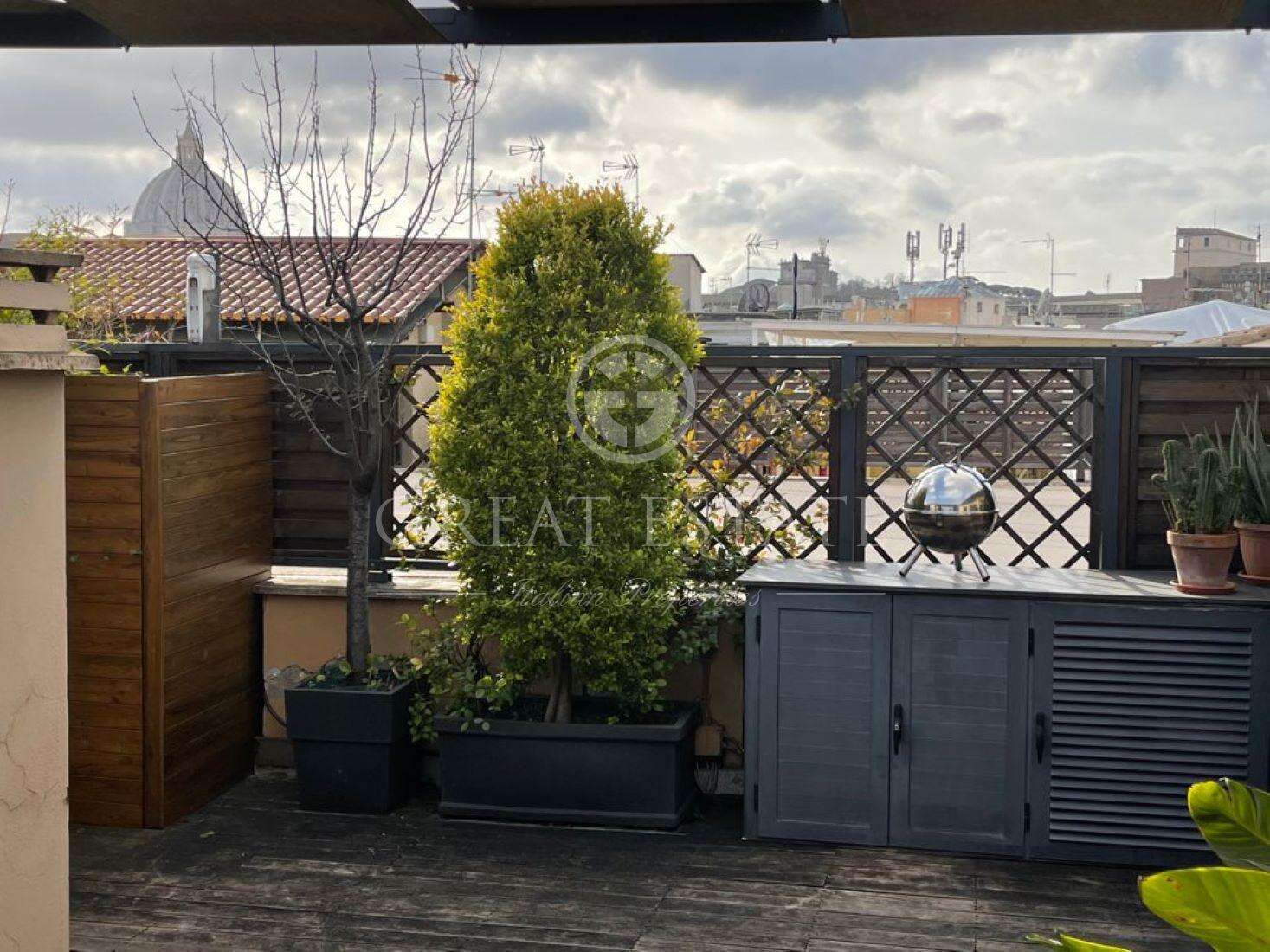 Set within a noble palace of five floors with lift, this attic is provided with a terrace of about 100sqm, which is a very rare characteristic in this neighbourhood. The apartment, of 60sqm, is characterised by extreme brightness, granted by the very large windows that can be completely opened or shaded. It is composed of a spacious living area with kitchenette, 1 bedroom with small walk-in closet and en suite bathroom, another bedroom and a guest bathroom. The terrace is provided with two automatic pergola curtains and is furnished with plants and flowers. From here and from the living area you can enjoy magnificent panoramic view of Rome and San Pietro. A very rare property.