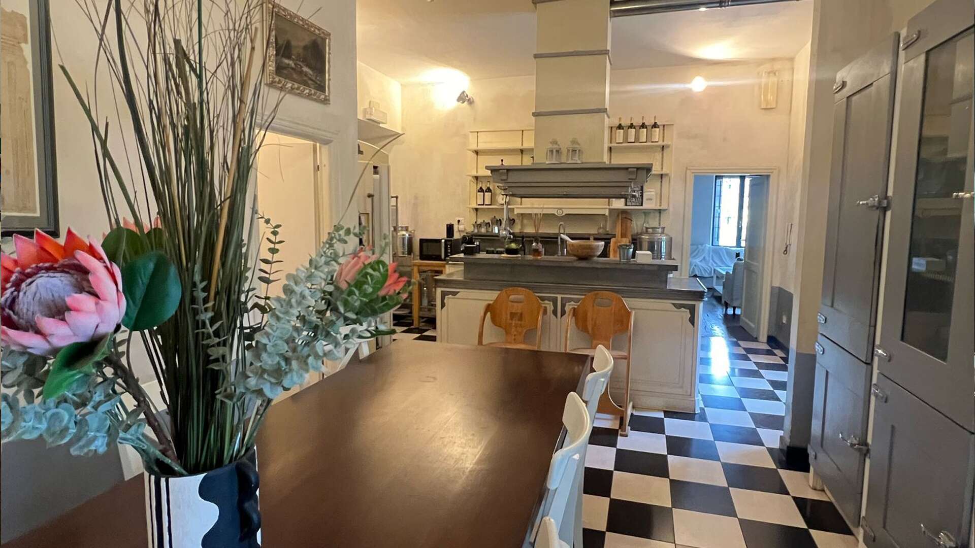On the raised ground floor, there is a large, bright double living room with flooring made from reclaimed wood sourced from a historic chalet in South Tyrol, a spacious custom kitchen with a central island (enhanced by original black and white ceramic tiles from the Netherlands); the kitchen’s design masterfully blends retro style with modern touches and includes a double oven, a teppanyaki cooking plate, and all the amenities for those who love to entertain.