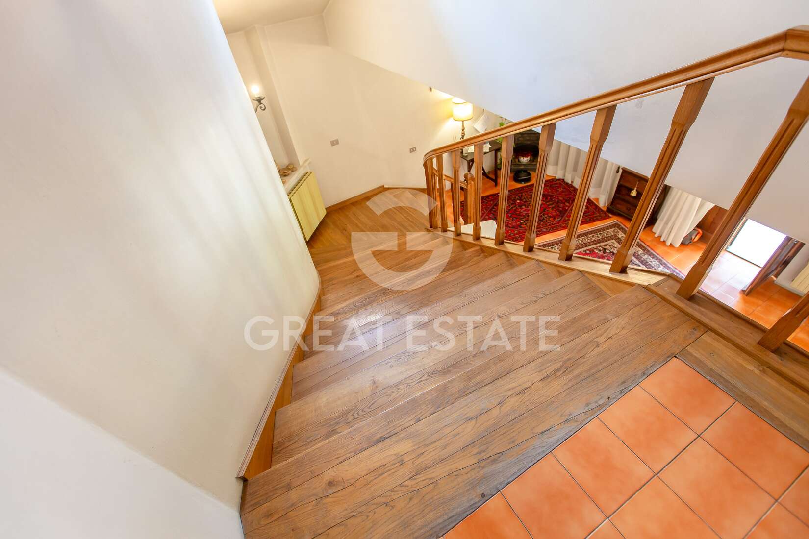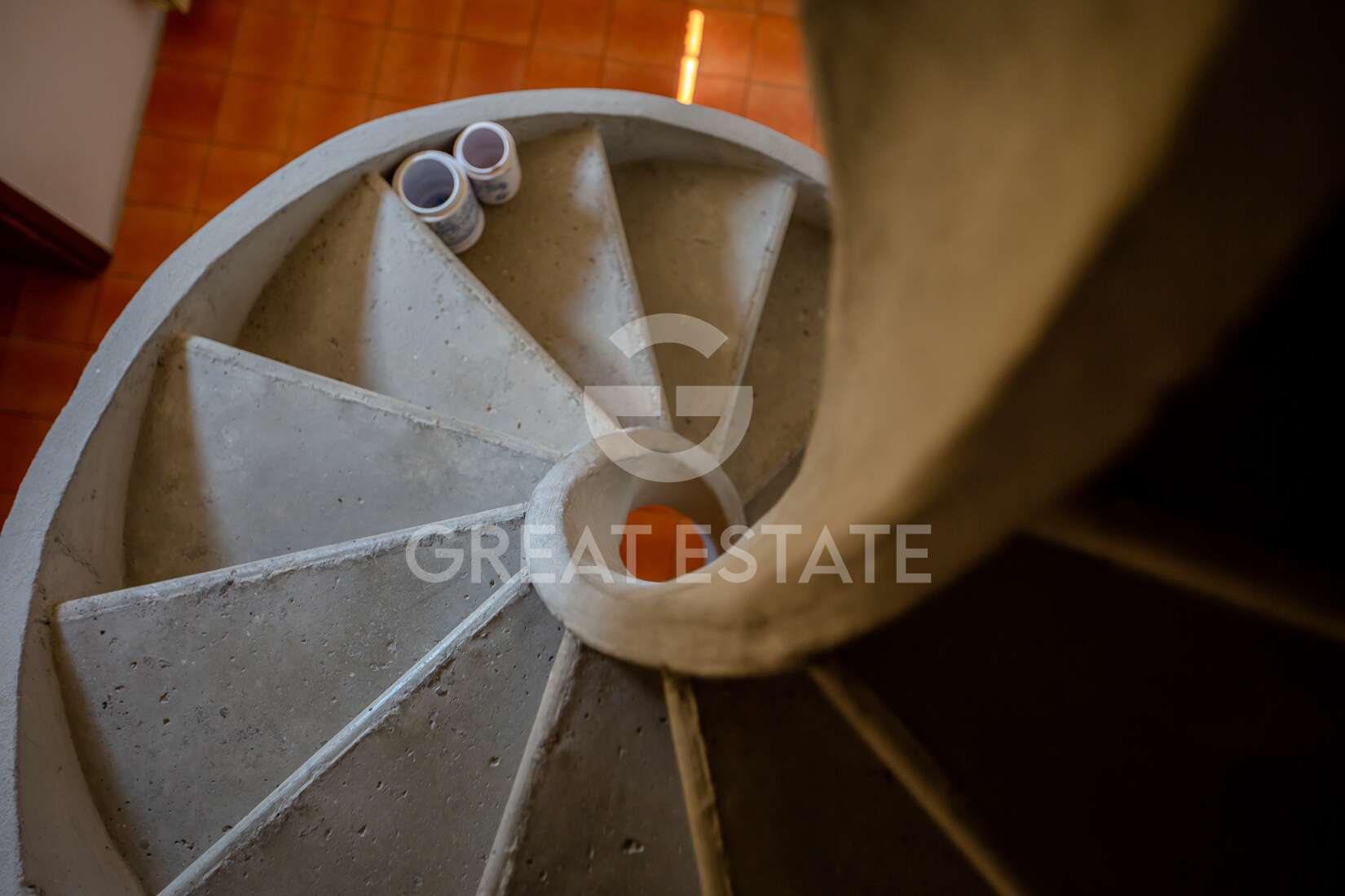 Internally, on the ground floor, there is a large living room with a fireplace, used as a living and dining area. The kitchen, also equipped with a fireplace, provides direct access to a laundry area and a full bathroom. From the living room, a wooden staircase leads to the upper floor, where there are 4 bedrooms and 4 bathrooms, in addition to a study, which is ideal for becoming a fifth bedroom. The spiral stone staircase leads to the attic, converted into a pleasant wooden library.
