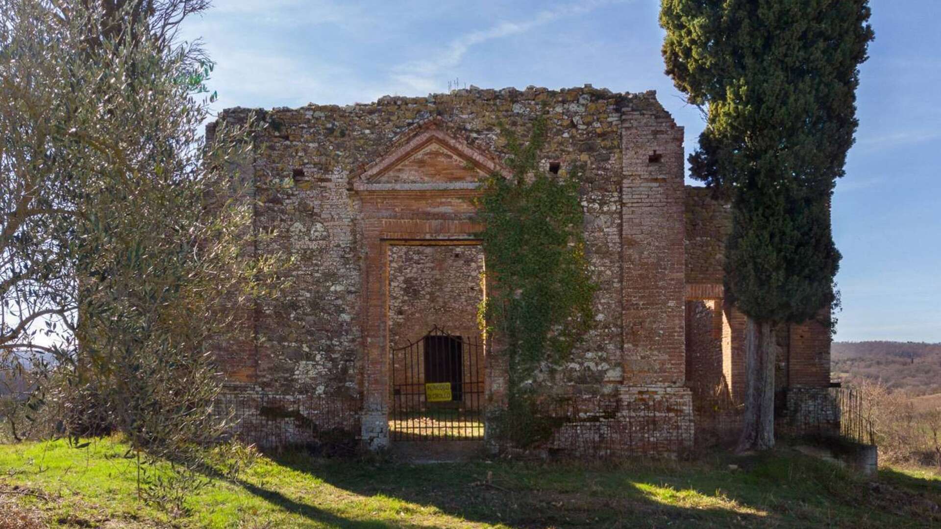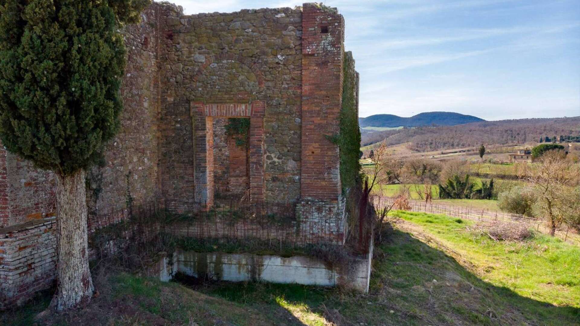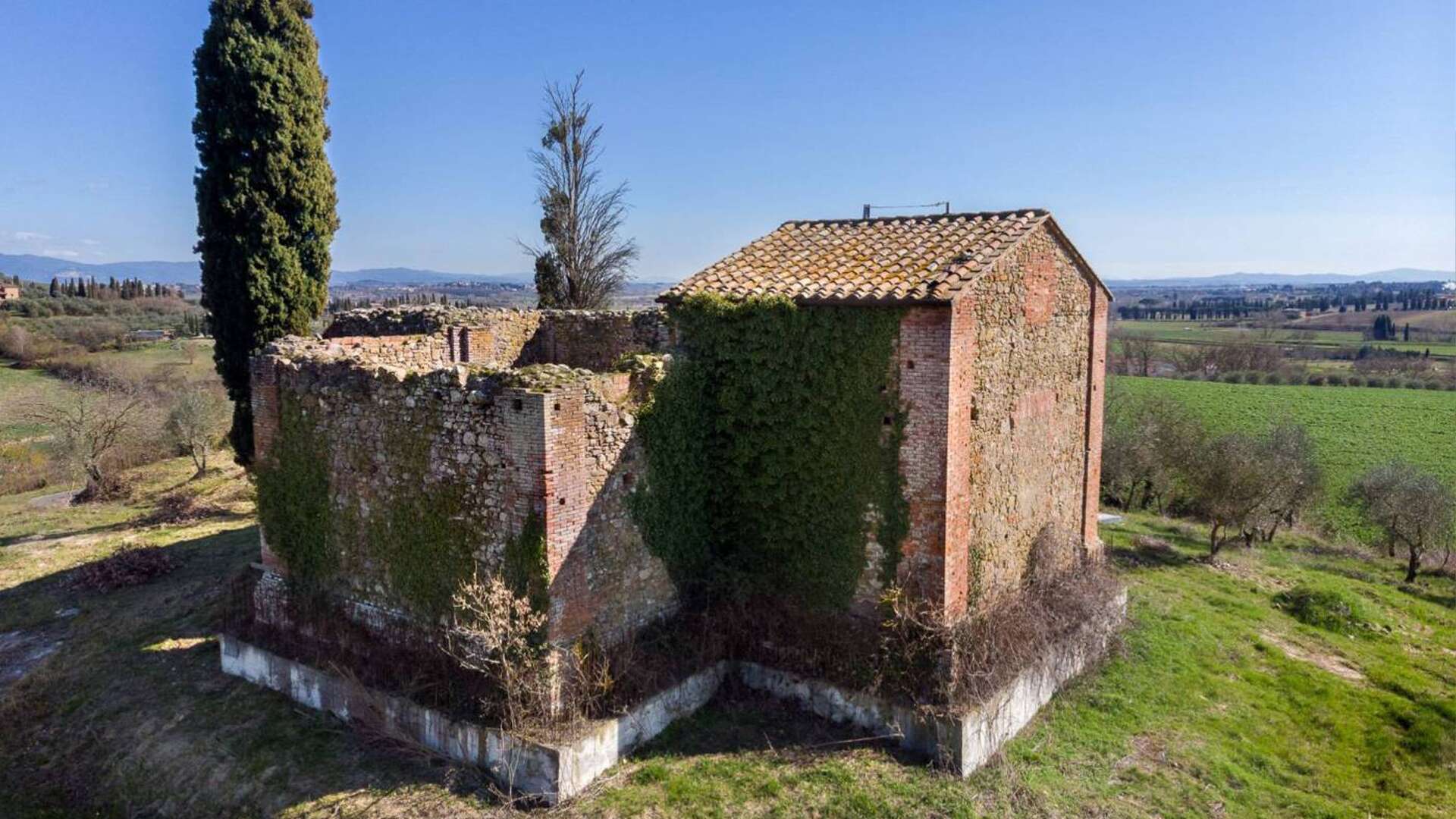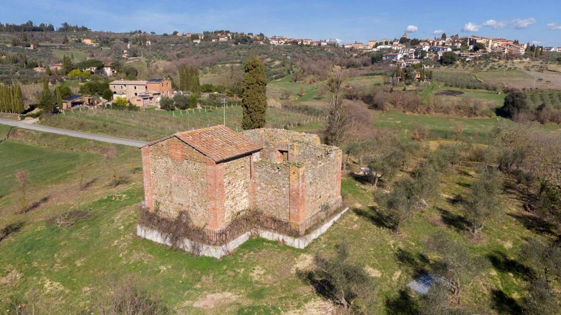 This ancient deconsecrated Church built in 1650 under the guidance of the Archbishop of Grosseto Giò Battista de Gori Pannellini;the structure is laid out in the form of a greek cross and inside remains a beautiful original fresco of The Madonna and Child. The total floor area is 250 sq.m(included in this figure is a stunning summer living zone situated on the large roof terrace with splendid views.) At present the church is a ruin with parts of the roof collapsed and the structure has a height of 6m.The property is set on small hill surrounded by 0.5 ha of garden with 50 olive trees.
