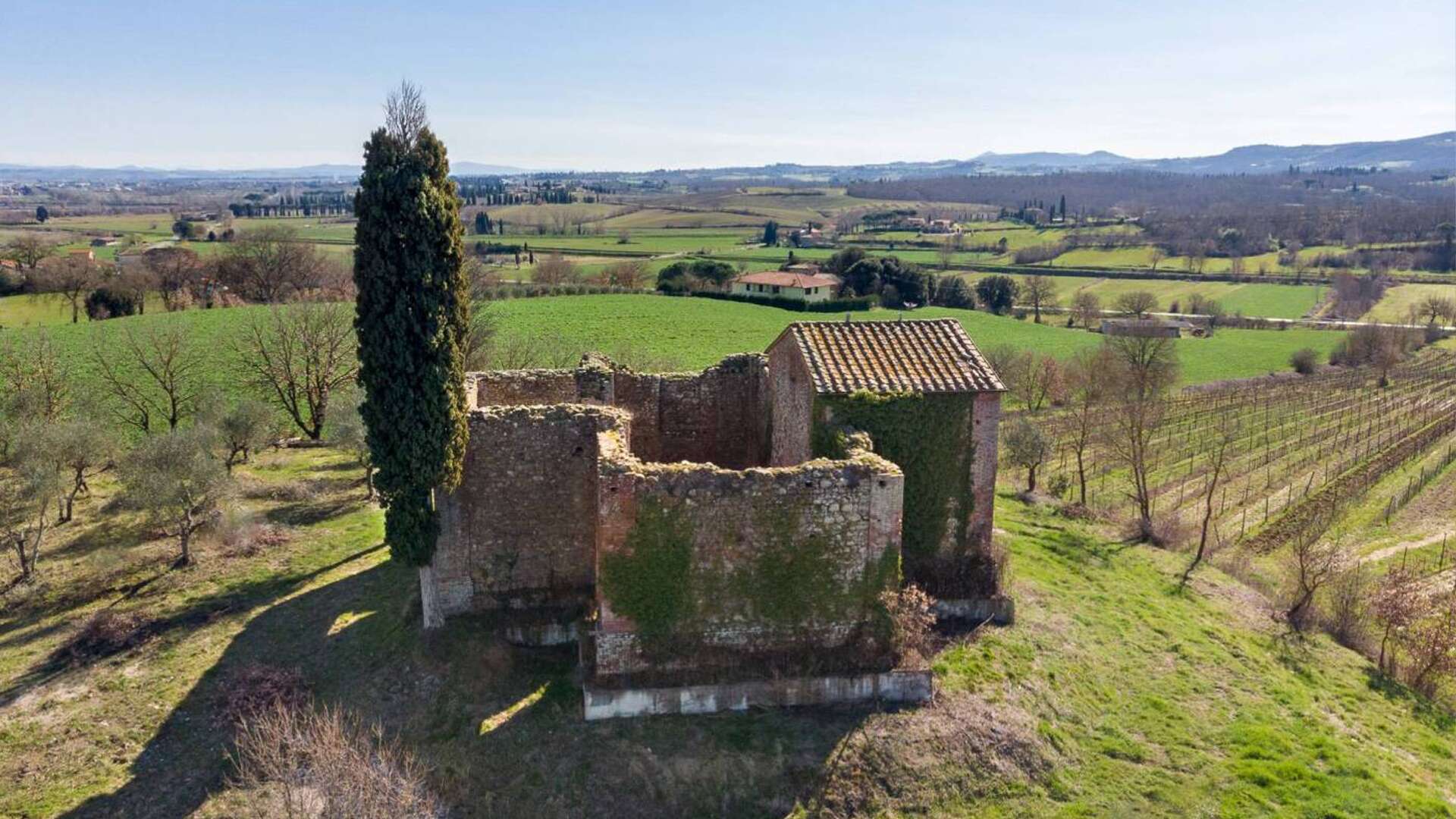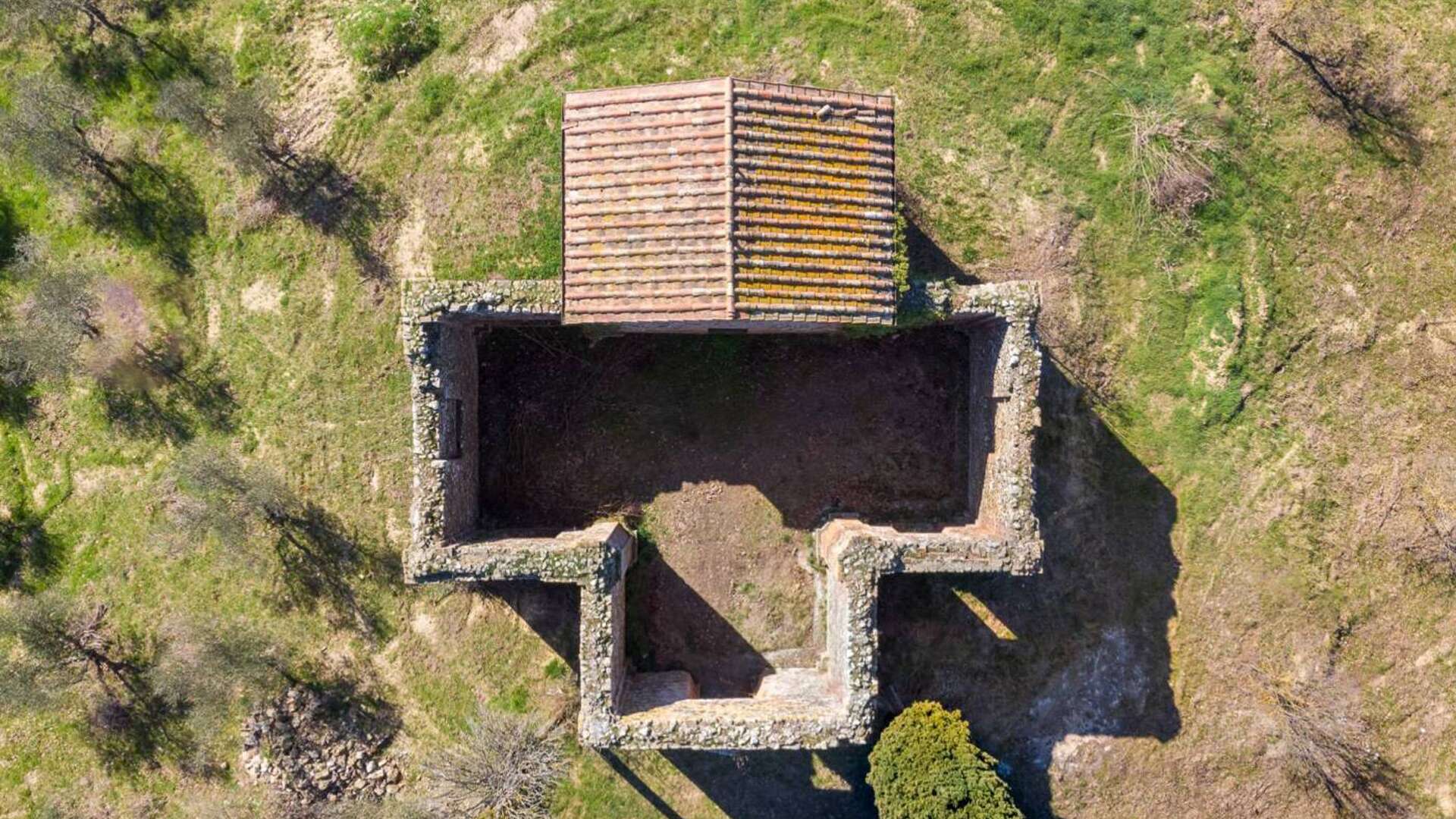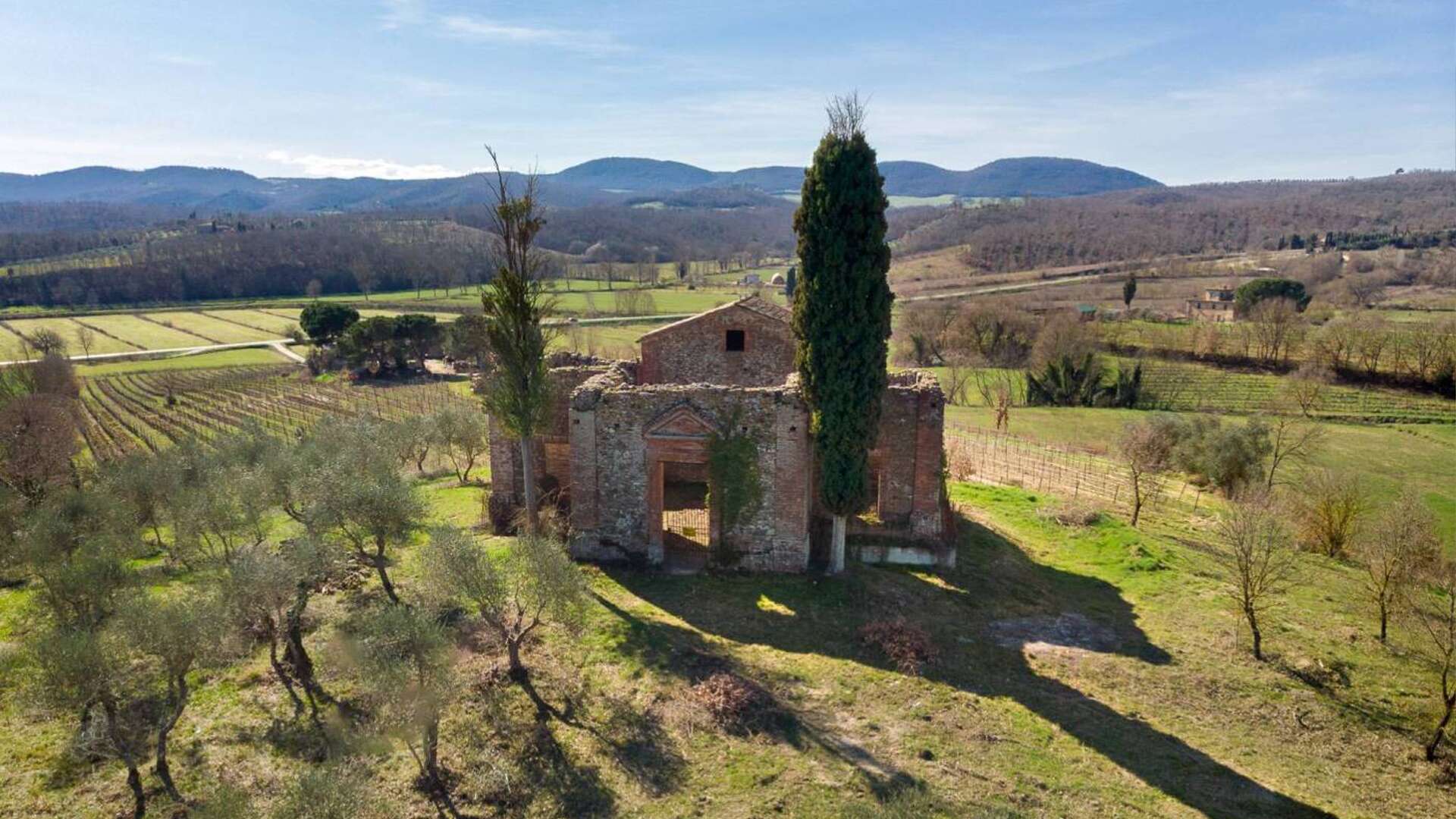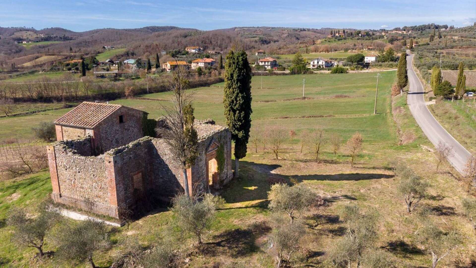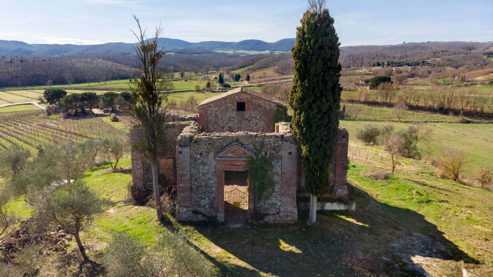 This ancient deconsecrated Church built in 1650 under the guidance of the Archbishop of Grosseto Giò Battista de Gori Pannellini;the structure is laid out in the form of a greek cross and inside remains a beautiful original fresco of The Madonna and Child. The total floor area is 250 sq.m(included in this figure is a stunning summer living zone situated on the large roof terrace with splendid views.) At present the church is a ruin with parts of the roof collapsed and the structure has a height of 6m.The property is set on small hill surrounded by 0.5 ha of garden with 50 olive trees.