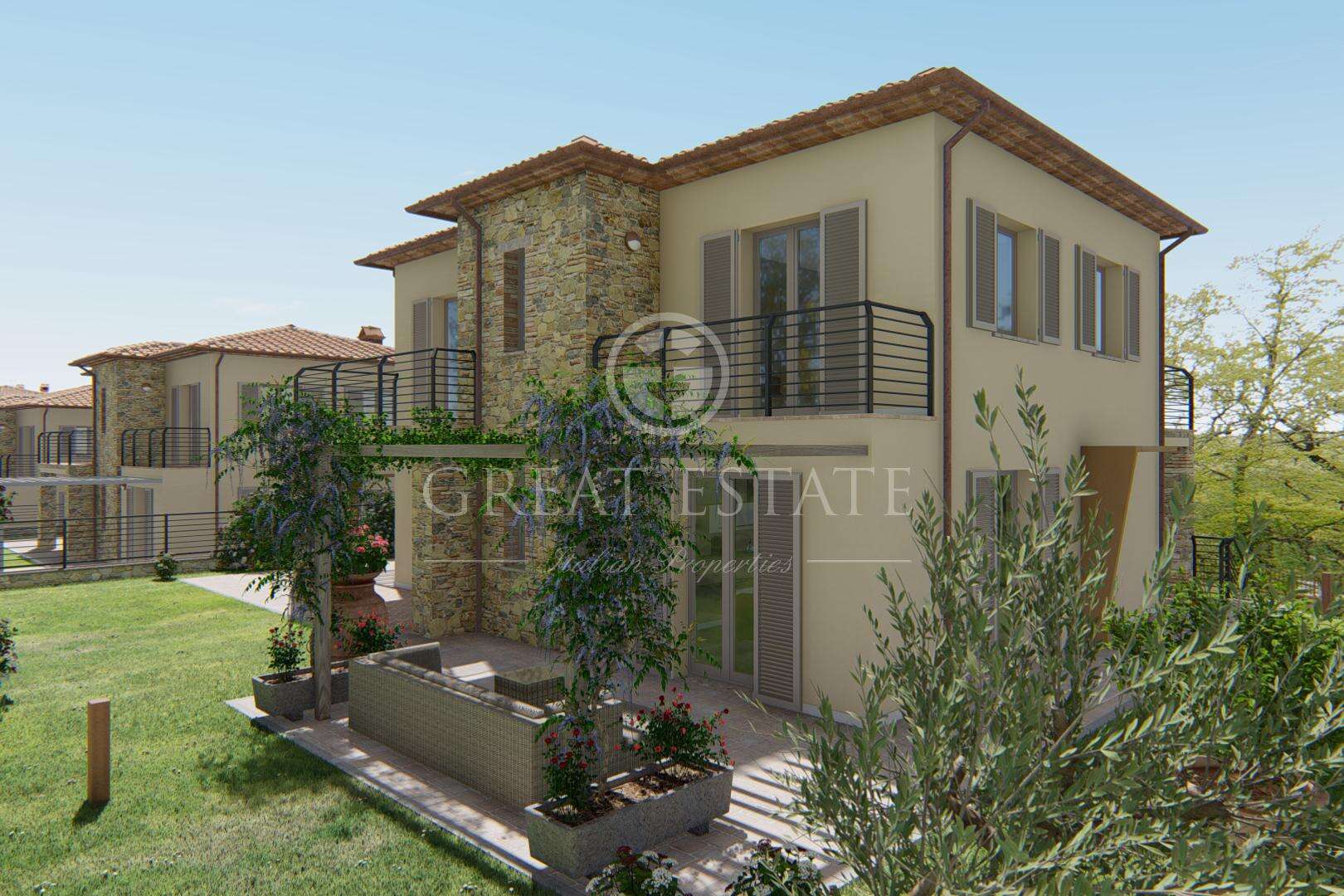 Newly built villa in Tuscany - Focaiole Alta 2. A stone's throw from the Terme di Fonteverde, in the most panoramic point of San Casciano dei Bagni, with a beautiful view of the valley and the historic center of the town, detached villa of about 250 sqm. on three levels (about 150 of living space on two levels and 100 square meters of ancillary rooms in the basement) with a private garden of about 300 square meters. as well as porches, pergolas and balconies. Currently to be built (the photos represent both the rendering of the finished property and some examples of similar villas already built by the Construction Company). The property will be located in the splendid Focaiole Alta residential complex, located just 500 meters from the historic center and the Terme di Fonteverde, in a unique context for the beauty of the landscape and the proximity to all services. The houses will be perfectly integrated into the surrounding architectural and environmental context, they will be built by a local construction company that takes great care and particular attention in reproducing the typical characteristics of the Tuscan building tradition. They will be equipped with every comfort and in Energy Class A ++. There is a wide range of internal customization possibilities. Internally the property will have the following layout: