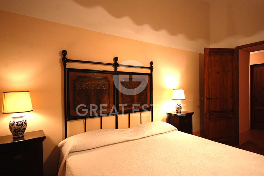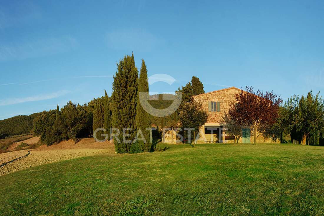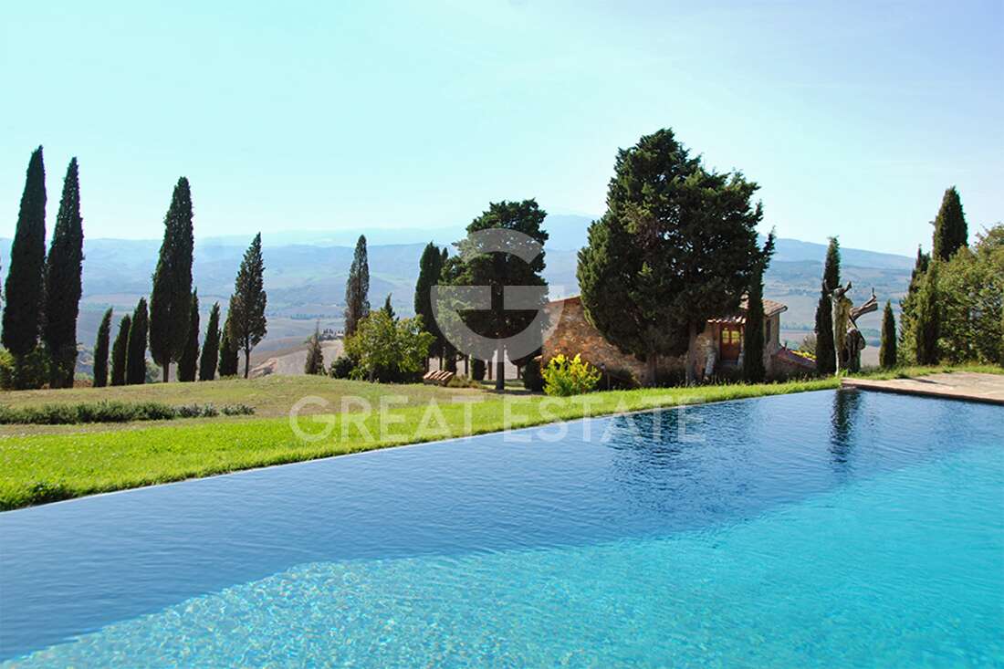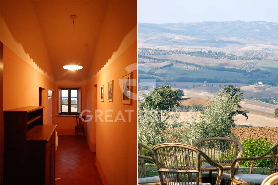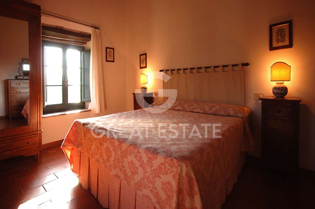 The property “La Vista sulla Vallata” is a typical Tuscan country house, in a hilly, private and panoramic location. The farmhouse spreads on two levels: at ground floor we have a garage, a finished space with bathroom, a large storage room and an external oven; on the upper level we find a living room with typical Tuscan fireplace, kitchen, three bedrooms and a bathroom. The property includes a surrounding land of about 28ha, with cypress-tree-lined boulevard, a marvellous panoramic infinity swimming pool and artificial lake for water collection.