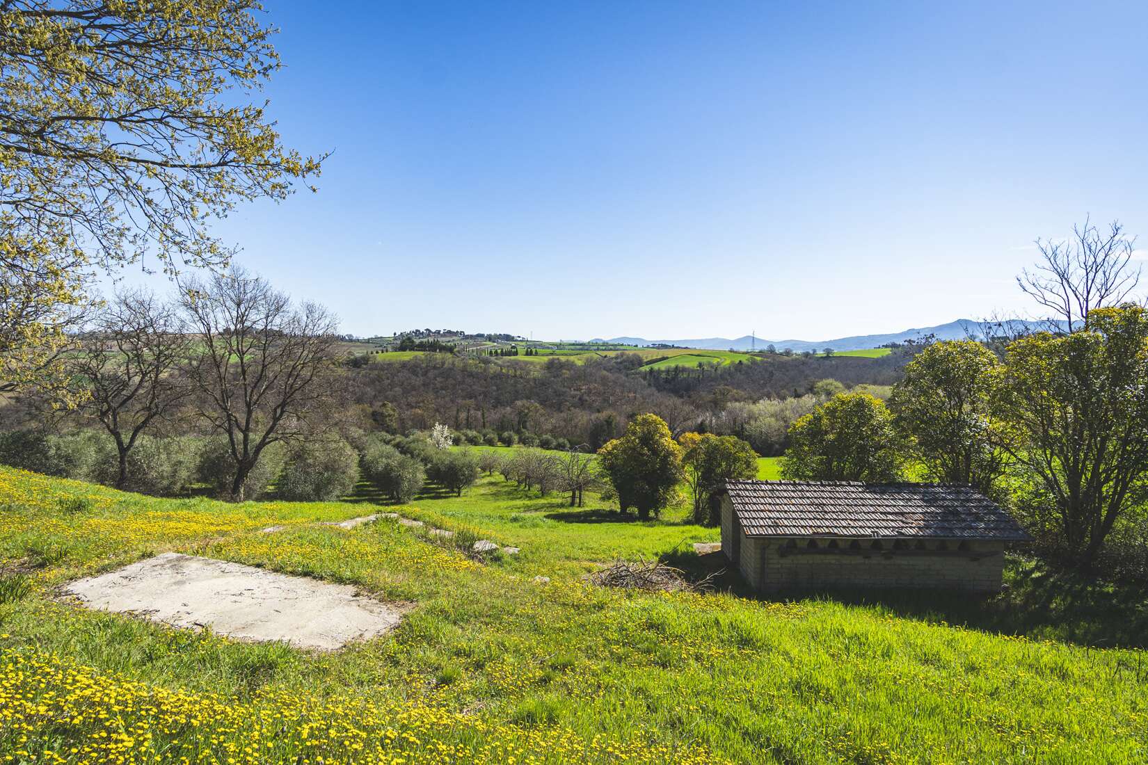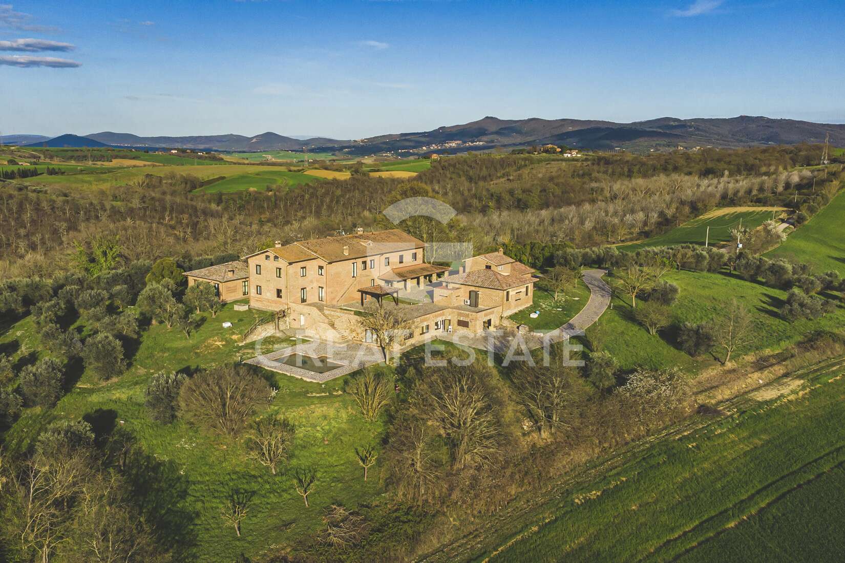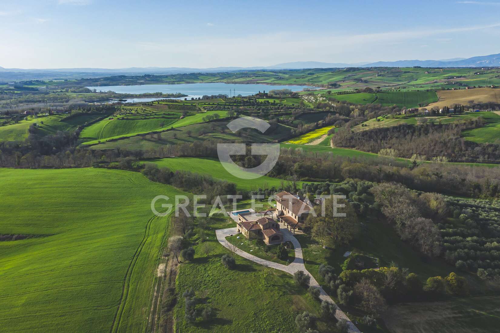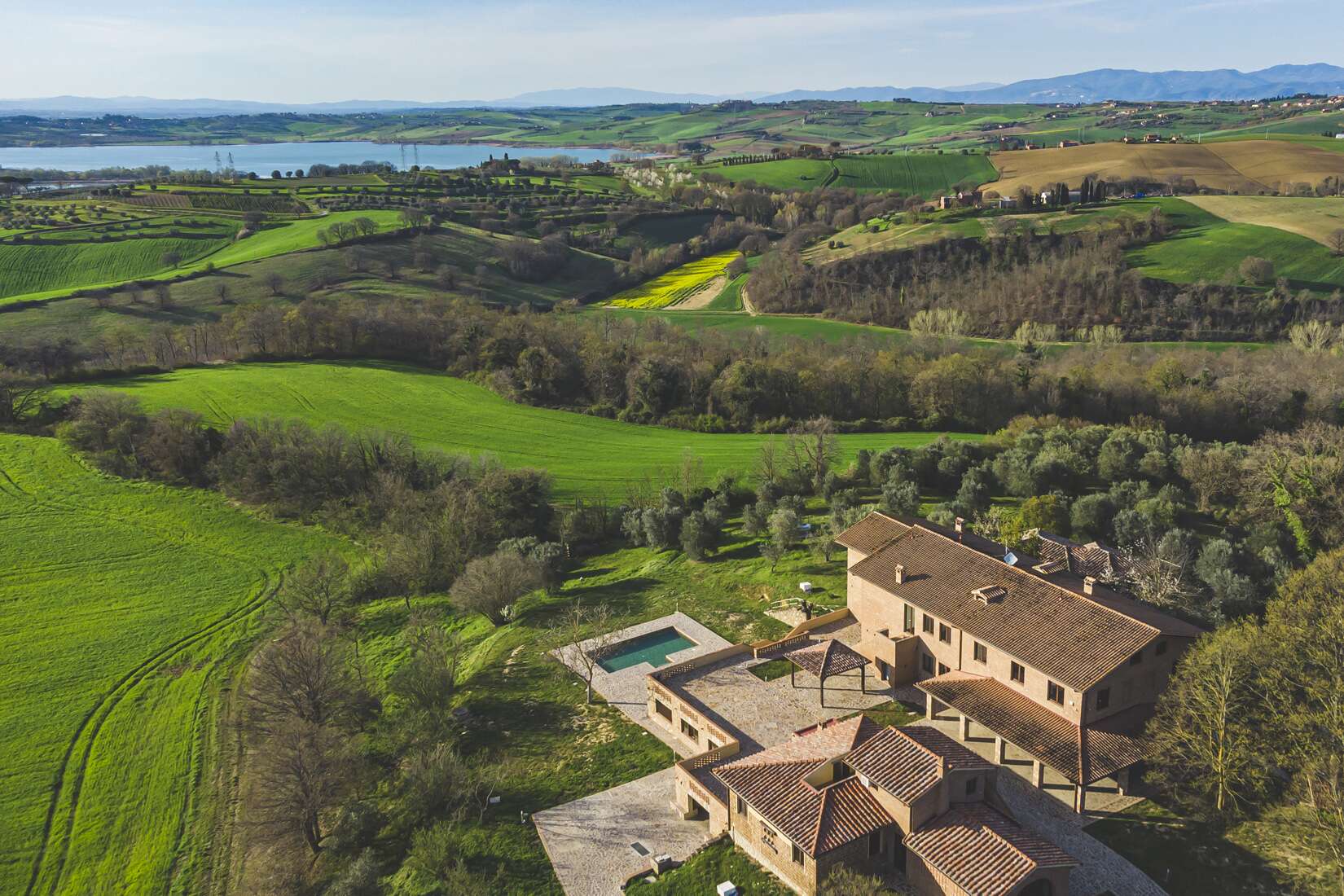 The farmhouse is located within a historic farm and hunting wildlife, on the border between Umbria and Tuscany. The property is located a few kilometres from Chiusi, Città della Pieve and Castiglione del Lago. Surrounded by woods, cultivated fields and olive groves with very suggestive views, the property can be reached after 3 km of perfectly maintained dirt road. The nearest village with services is 3 km away. The property is located halfway between Rome (150 km) and Florence (120 km), with the great advantage of being easily reachable by the A1 Florence-Rome motorway using the Chiusi-Chianciano Terme or Fabro exits, from which it is respectively 10 km and 20 km or by train using the nearby Chiusi-Chianciano Terme railway station.