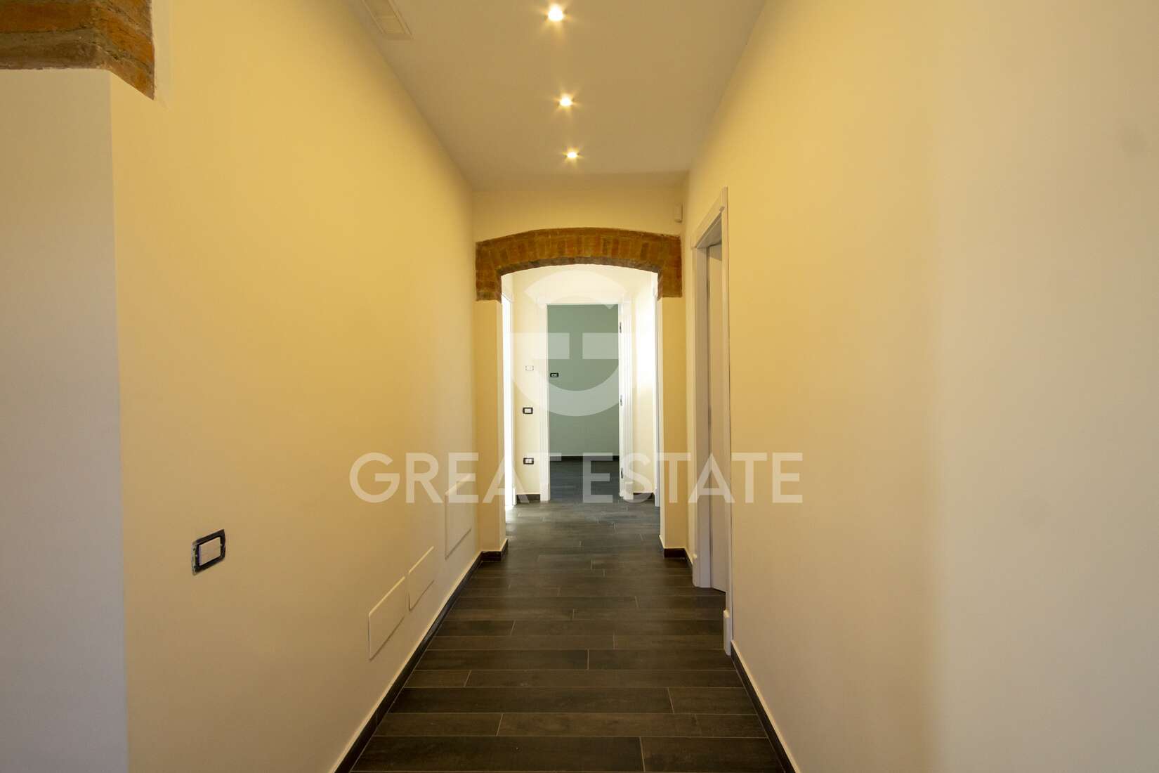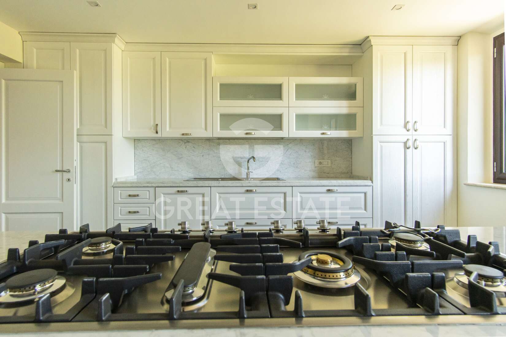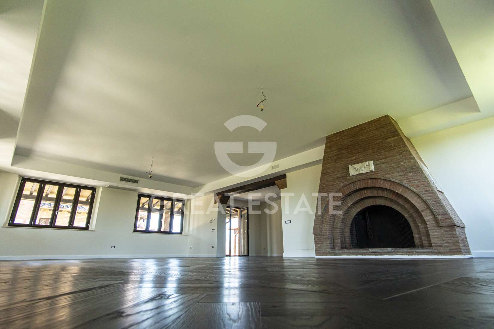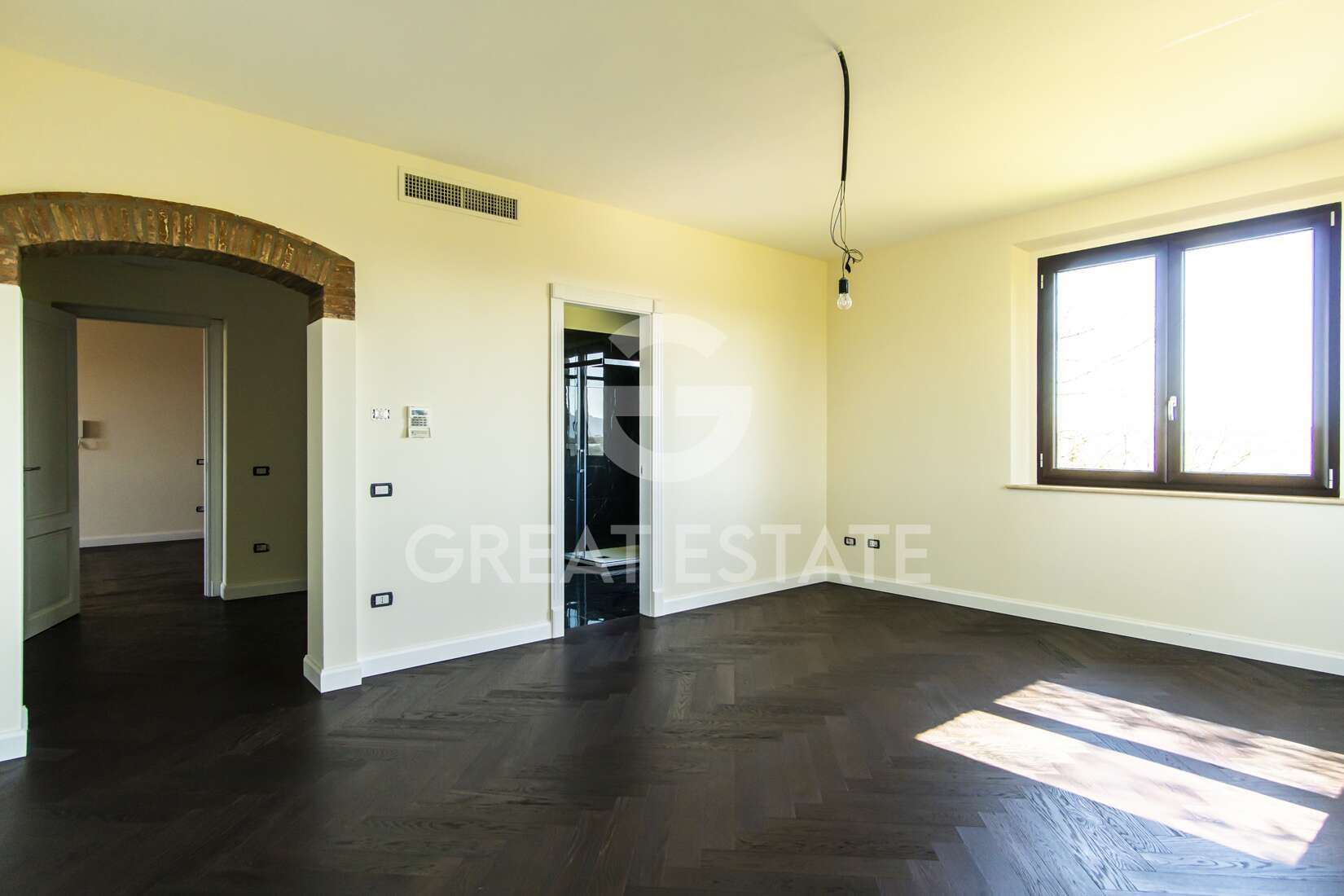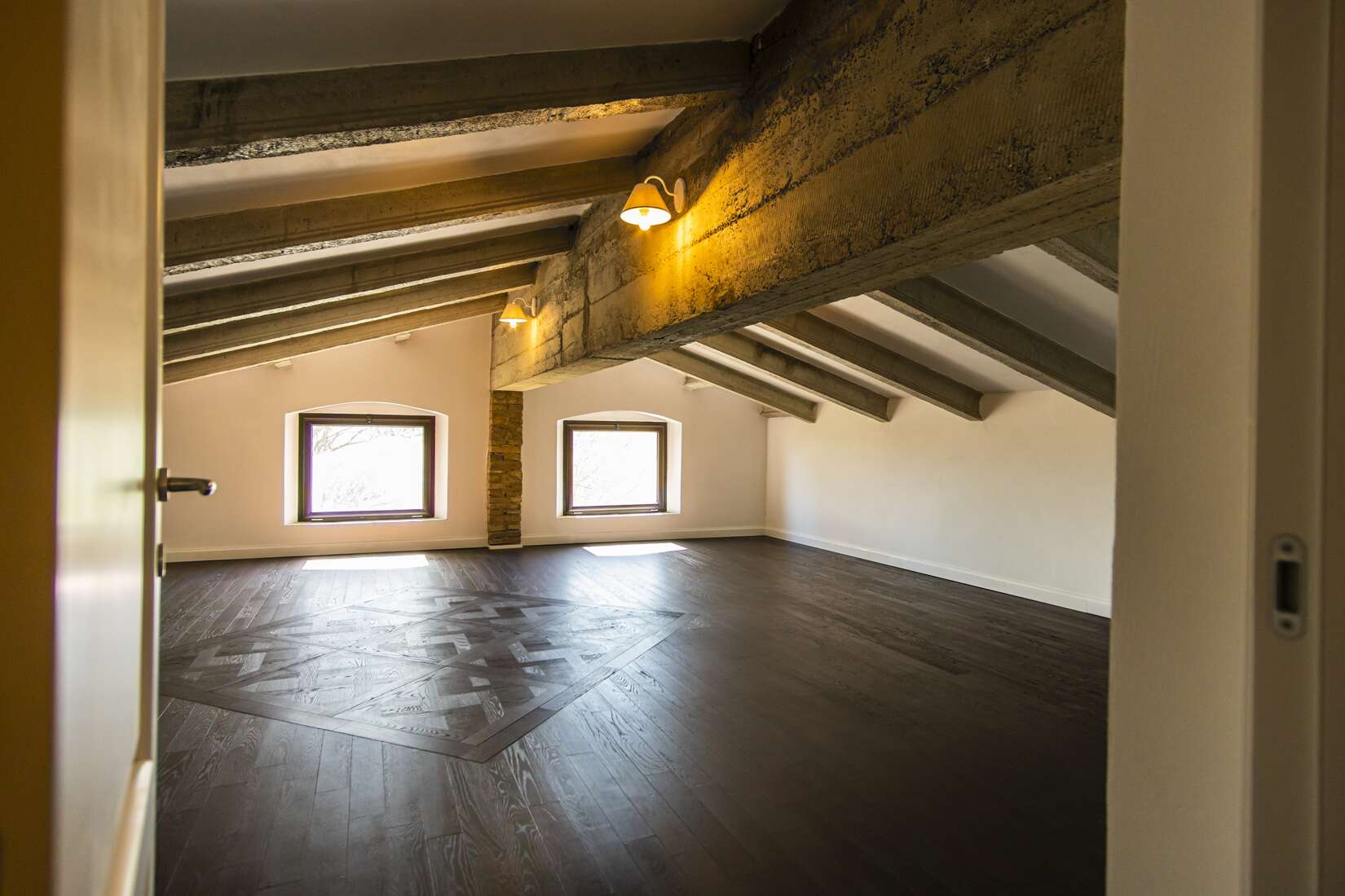 On the ground floor, you will find a large living room with a fireplace, a dining room, an equipped kitchen with a pantry, a hallway, a utility room, a study and a bathroom. On the same level, there is a technical room and a beautiful porch of 80 sqm. An elegant staircase leads to the second floor, consisting of a hallway, master bedroom with bathroom and wardrobe, 4 bedrooms with en-suite bathrooms, 2 other bedrooms, and another entrance hall corresponding to the ancient external staircase. Partially practicable attics of 335 square meters.