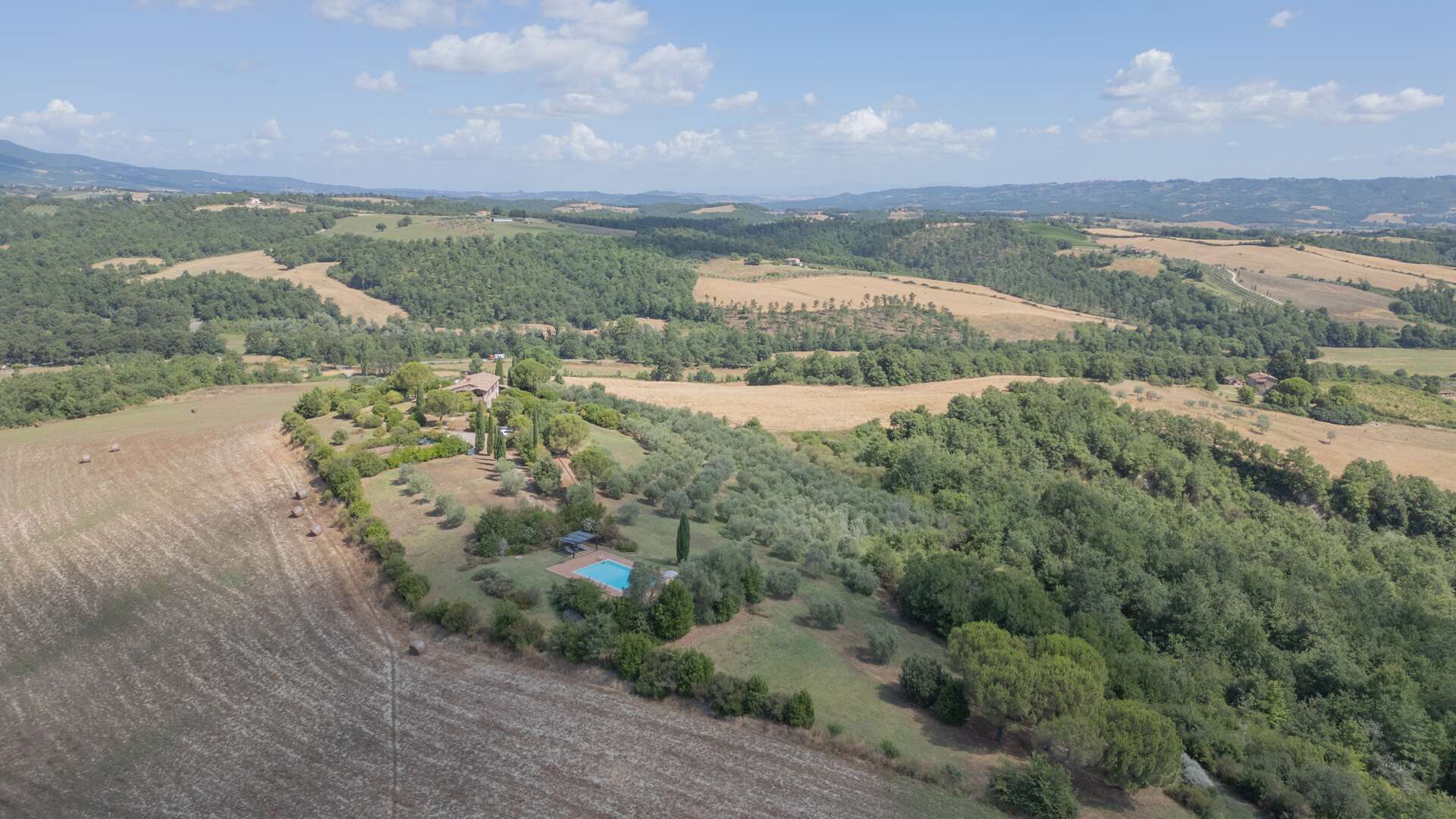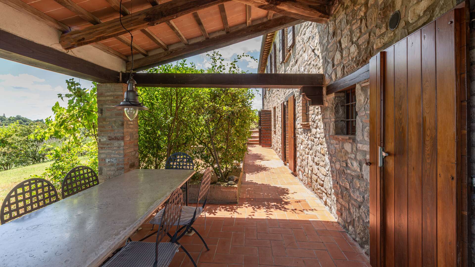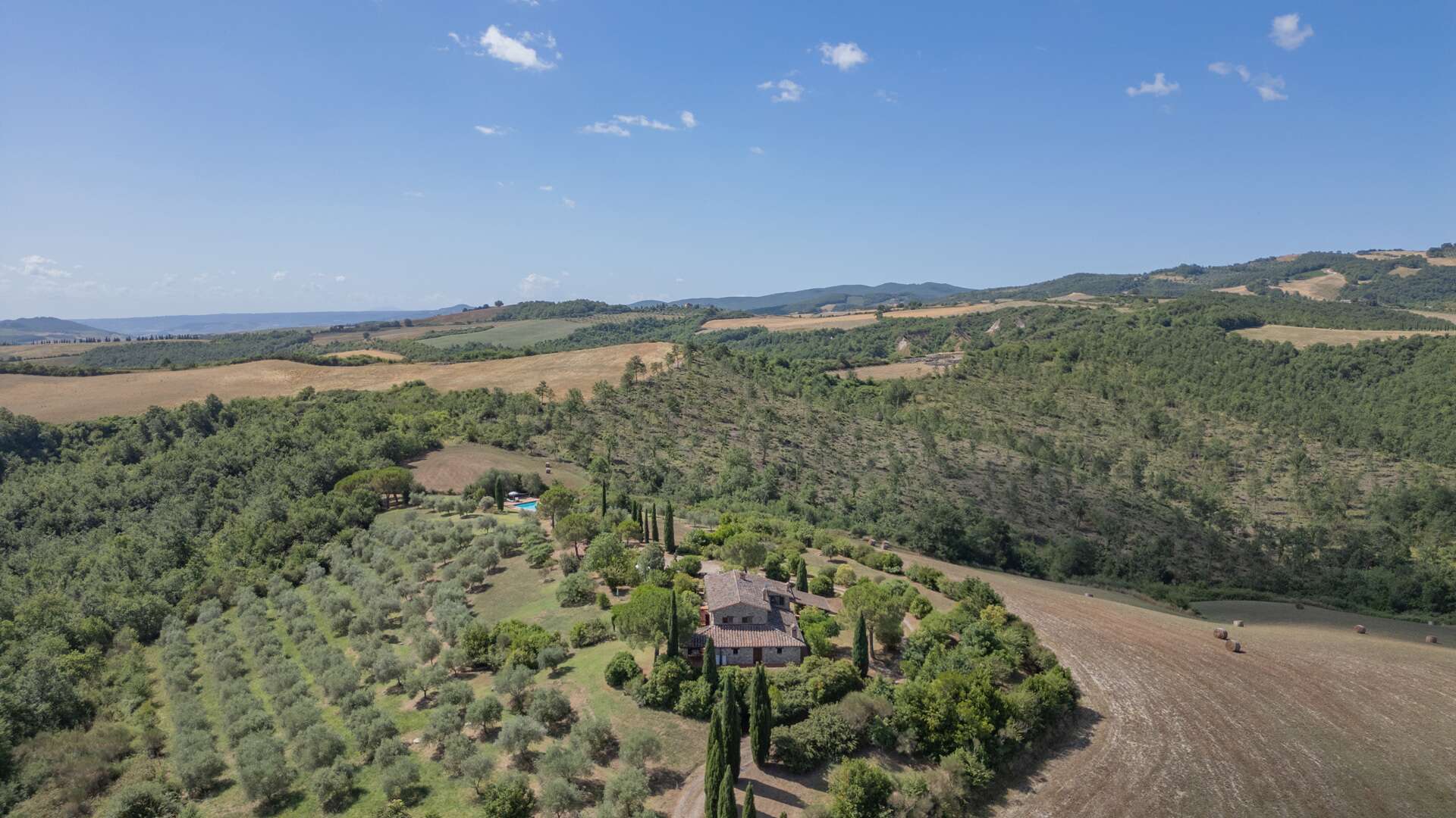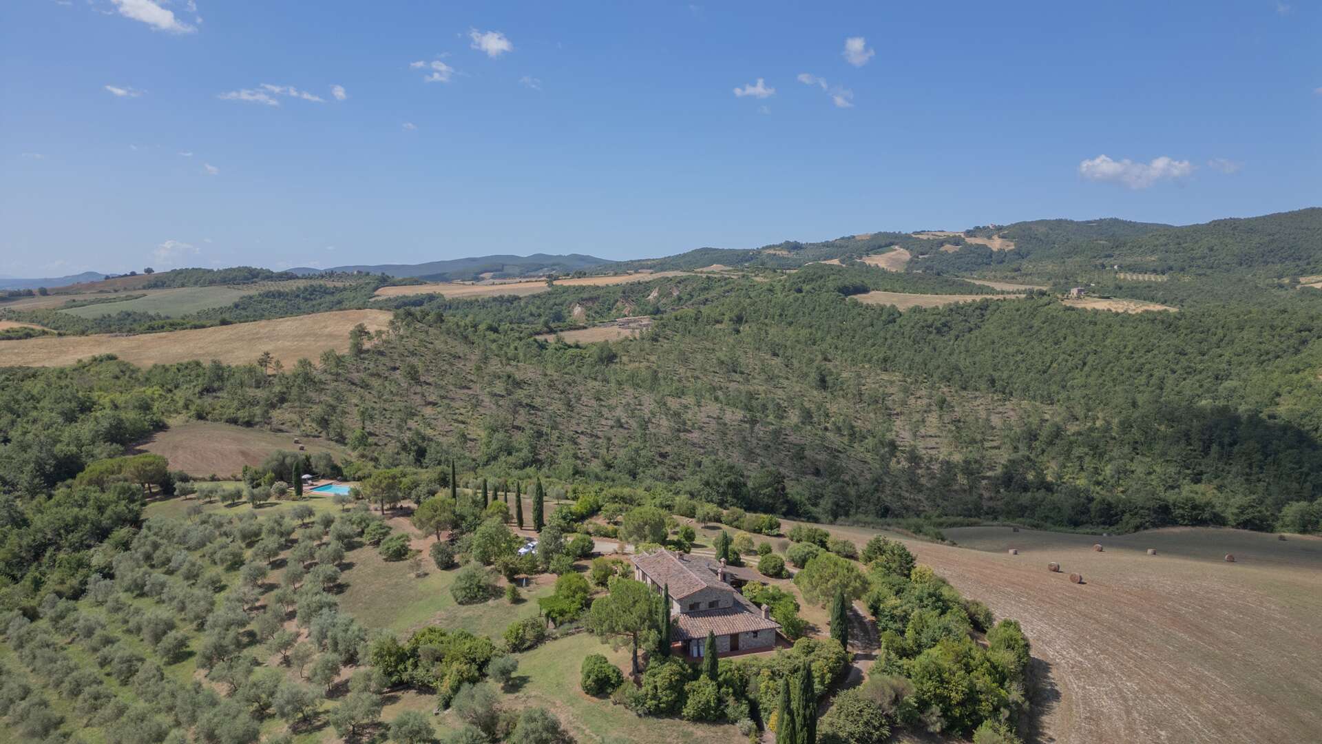 The farmhouse retains quintessential rustic features such as wooden beam ceilings, internal stone walls, and terracotta flooring. Situated in a unique, private, and panoramic location, the estate remains conveniently close to the main road and just 800 meters from a traditional restaurant.