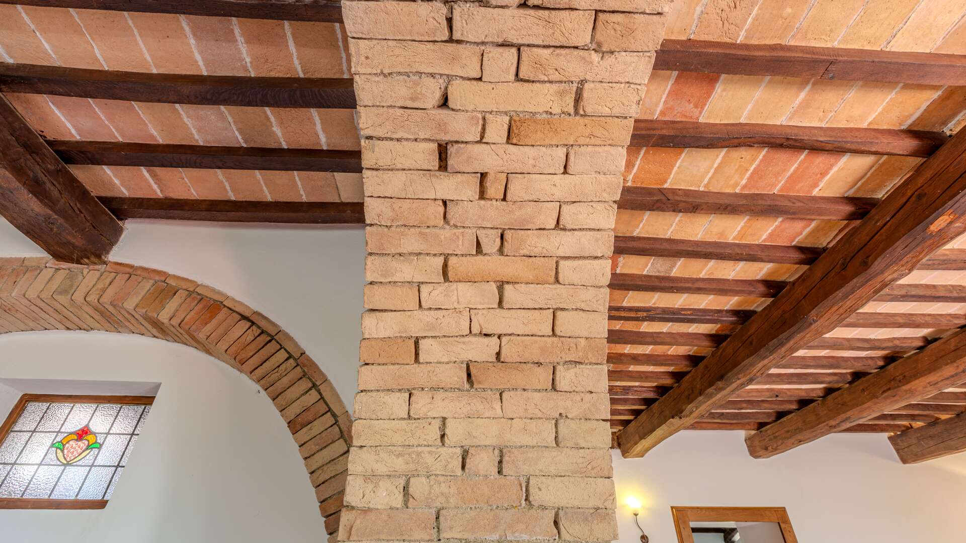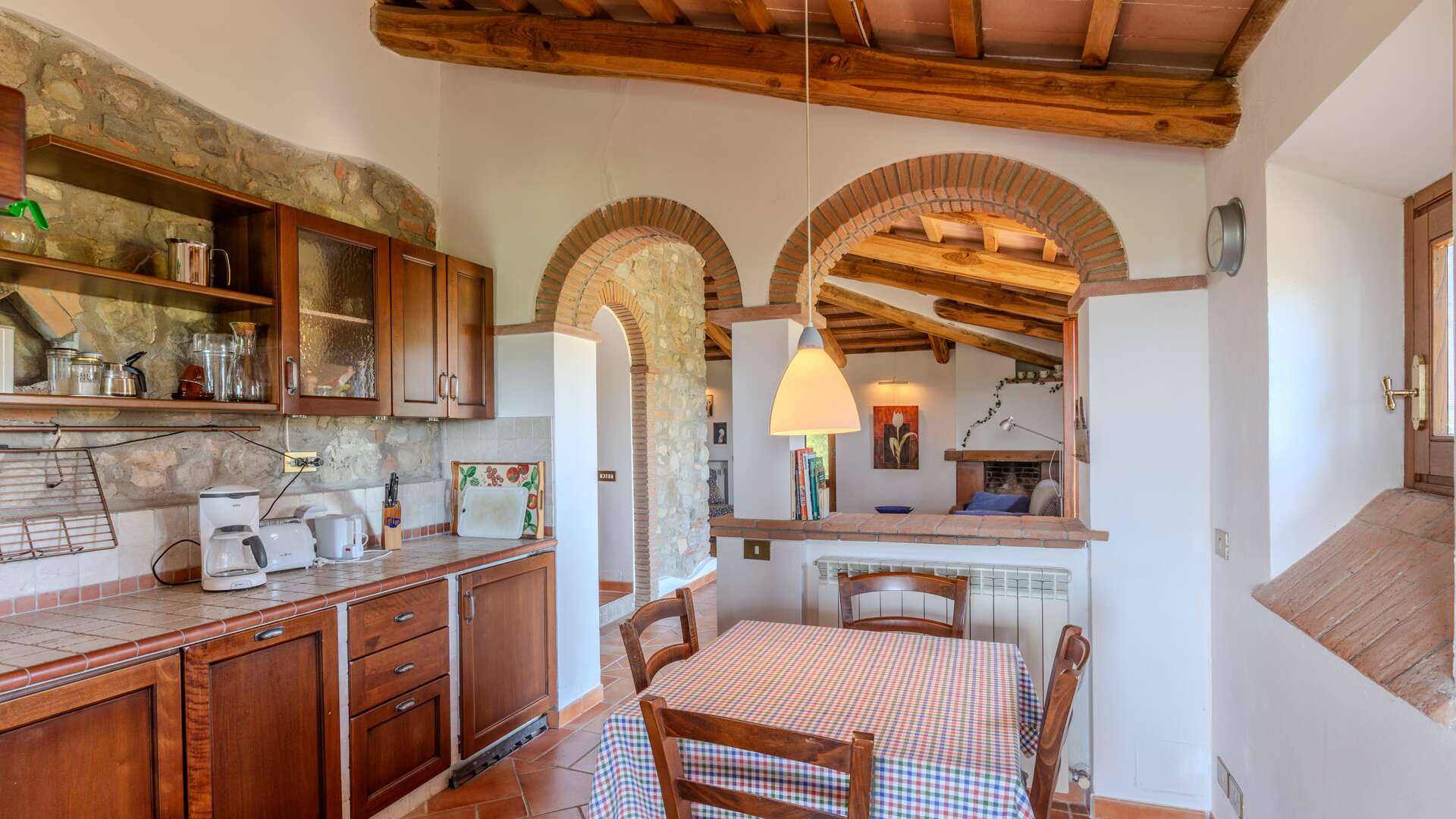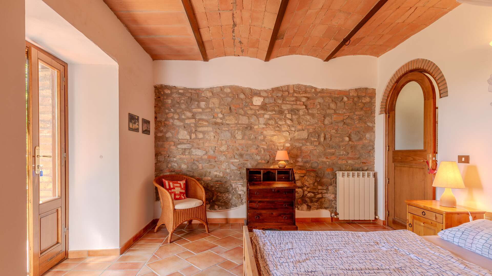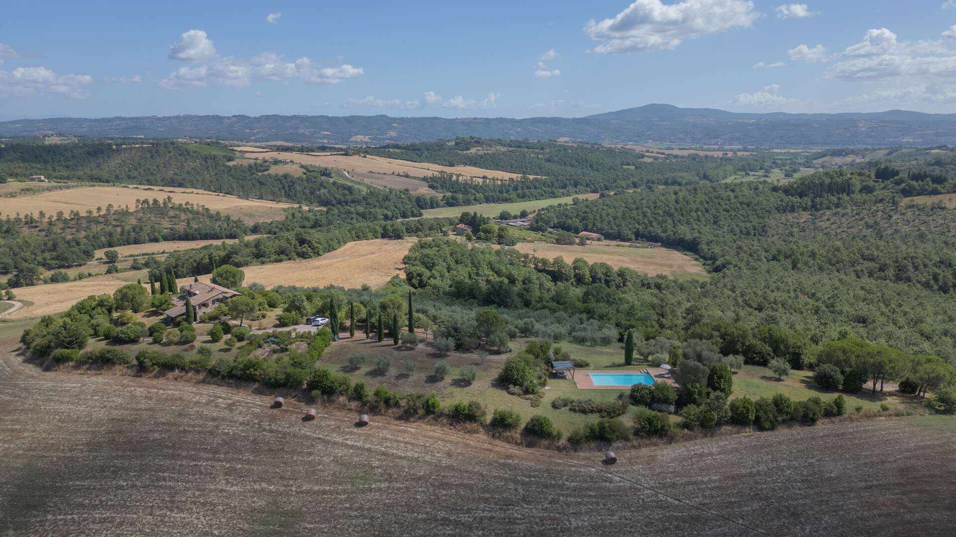 The farmhouse retains quintessential rustic features such as wooden beam ceilings, internal stone walls, and terracotta flooring. Situated in a unique, private, and panoramic location, the estate remains conveniently close to the main road and just 800 meters from a traditional restaurant.