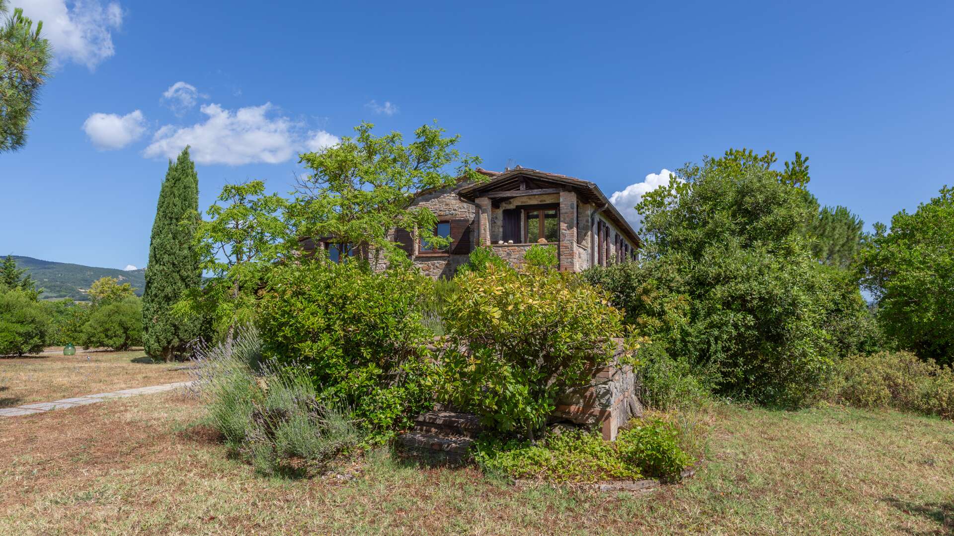 Set on approximately 1.7 hectares of fenced land, the property hosts around 164 olive trees, a vegetable garden, and a dedicated open-air plaza ideal for yoga, dancing, or hosting meetings amid nature. The current owners have also installed a bocce court in the area in front of the house, adding to the lifestyle amenities.