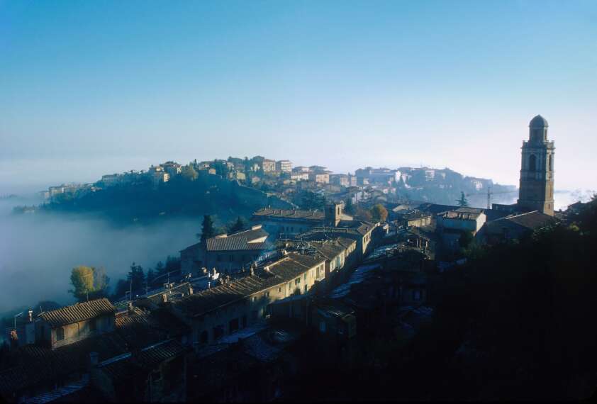 Hovedstaden Perugia som strekker seg opp gjennom nattens dugg